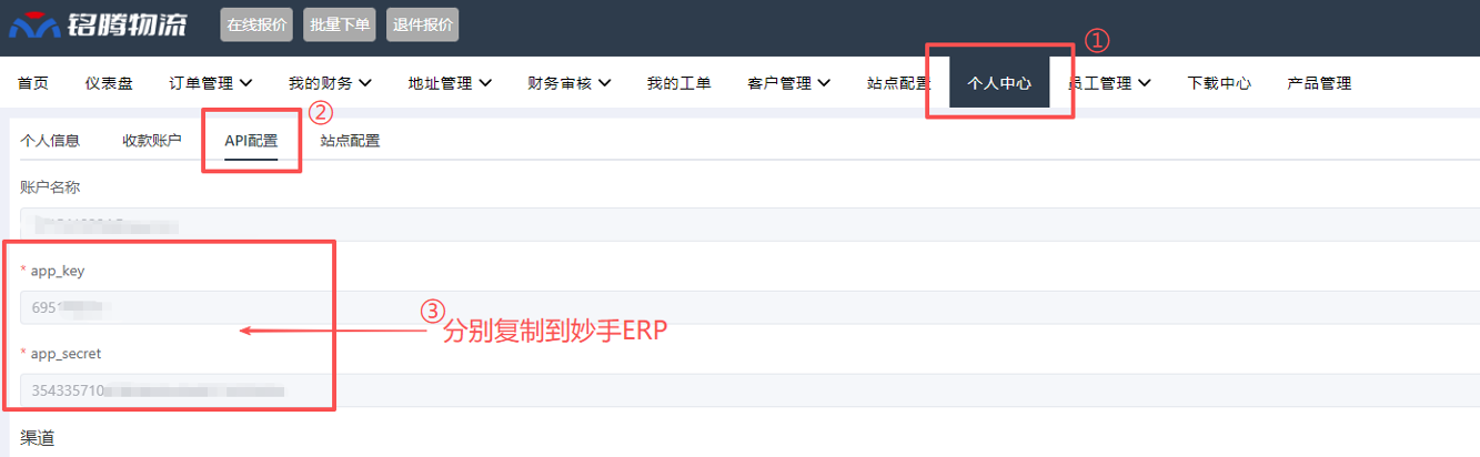 (1)登入铭腾物流后台=>点击菜单栏进入个人中心=>选择API配置=>分别复制app_key和app_Secret到妙手ERP