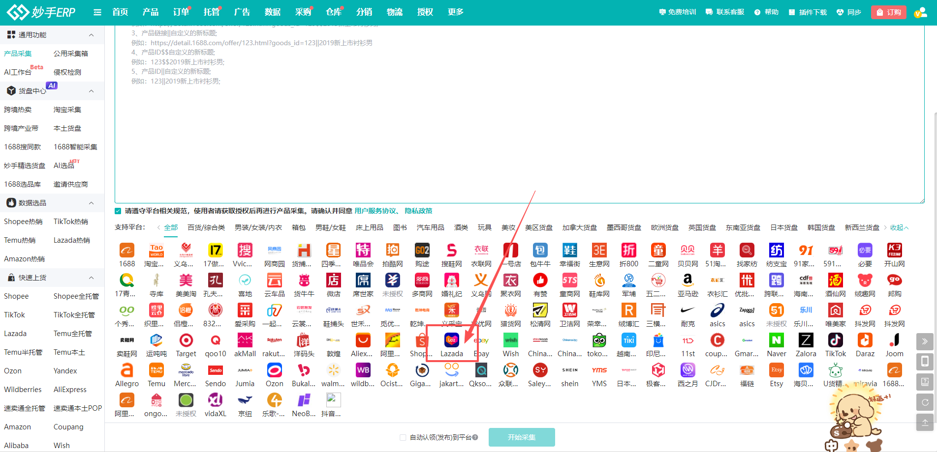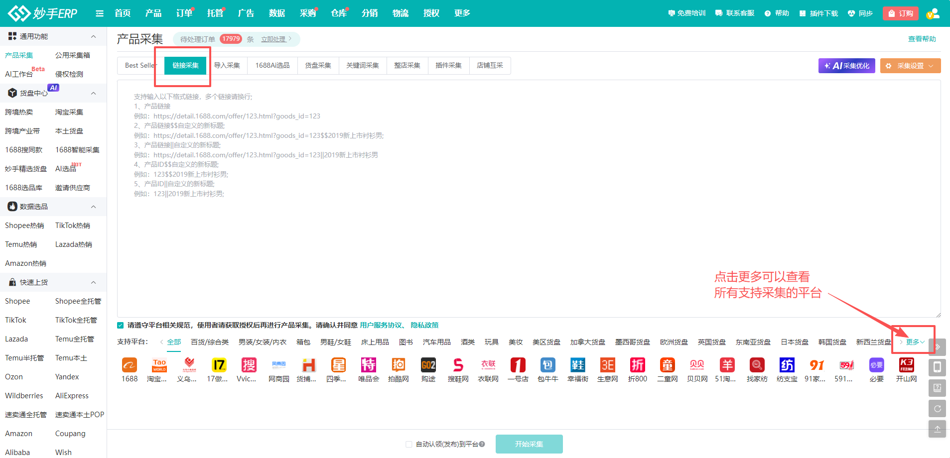 2、产品采集页面,选择链接采集,下方支持平台点击【更多】,展开所有支持采集的平台,点击Lazada图标