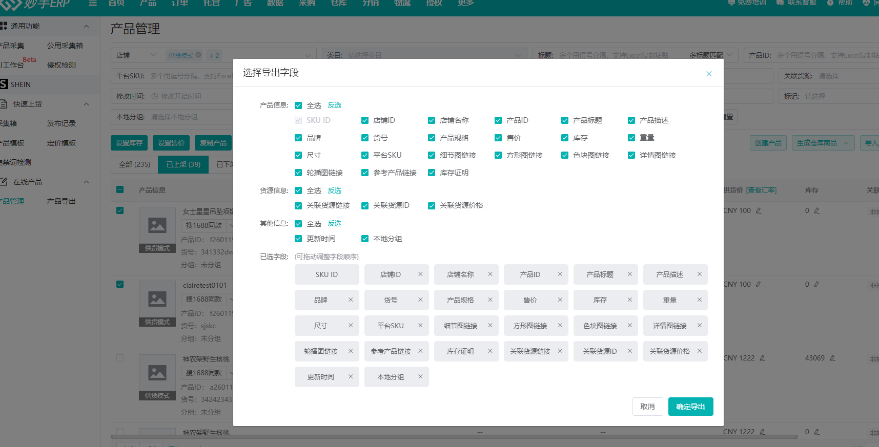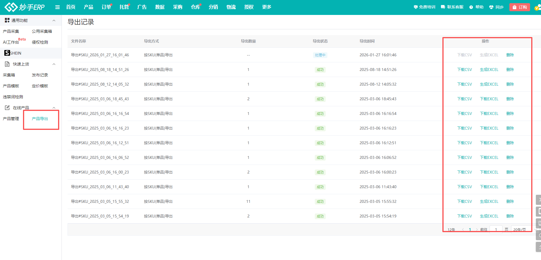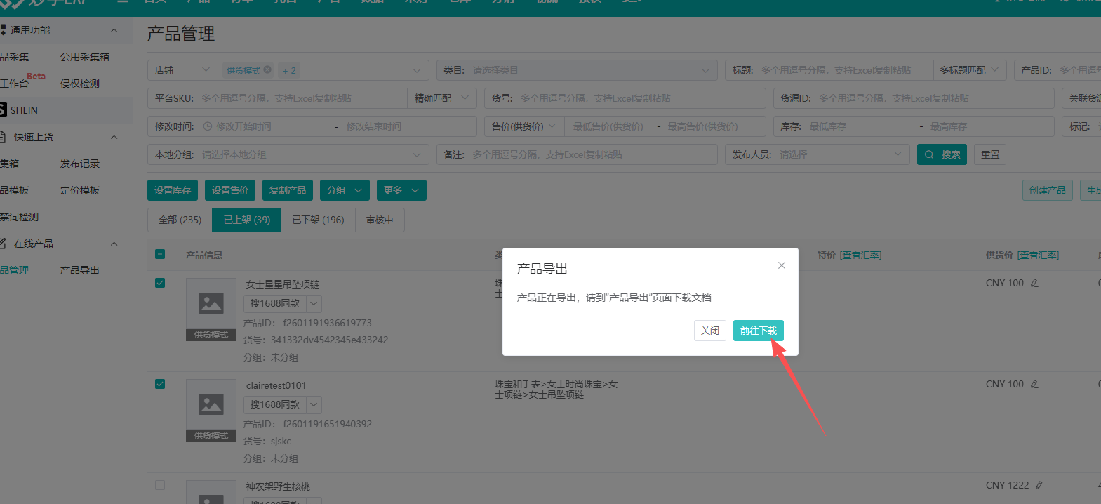 (2)店铺产品/产品管理导出