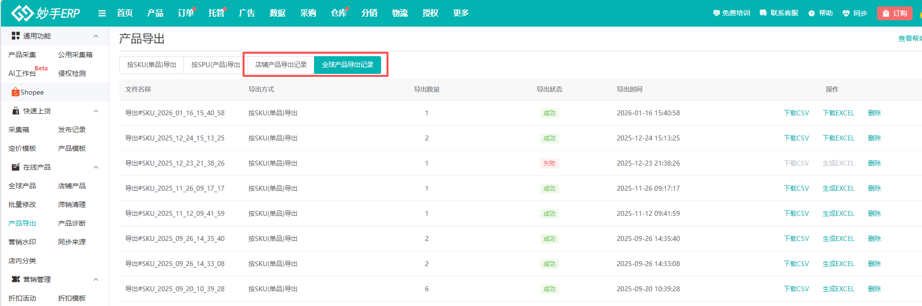 值得一提的是,针对Shopee平台,您还可以按“店铺产品”和“全球产品”两种维度分别查看和导出相应记录,为多店铺运营提供更大便利。