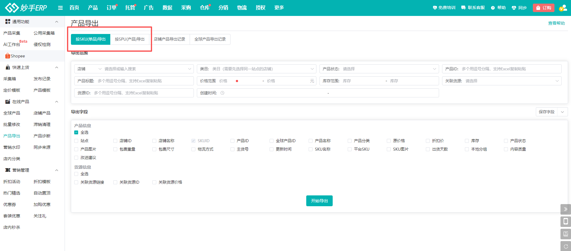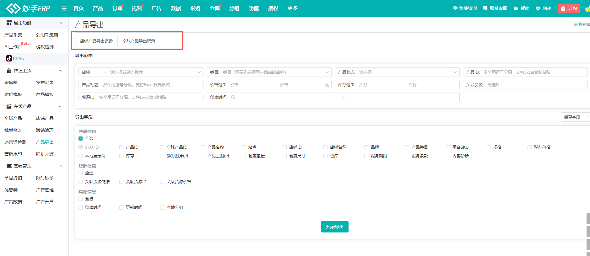 而部分平台(比如TikTok),则是按照店铺产品、全球产品导出,具体根据界面显示的为准