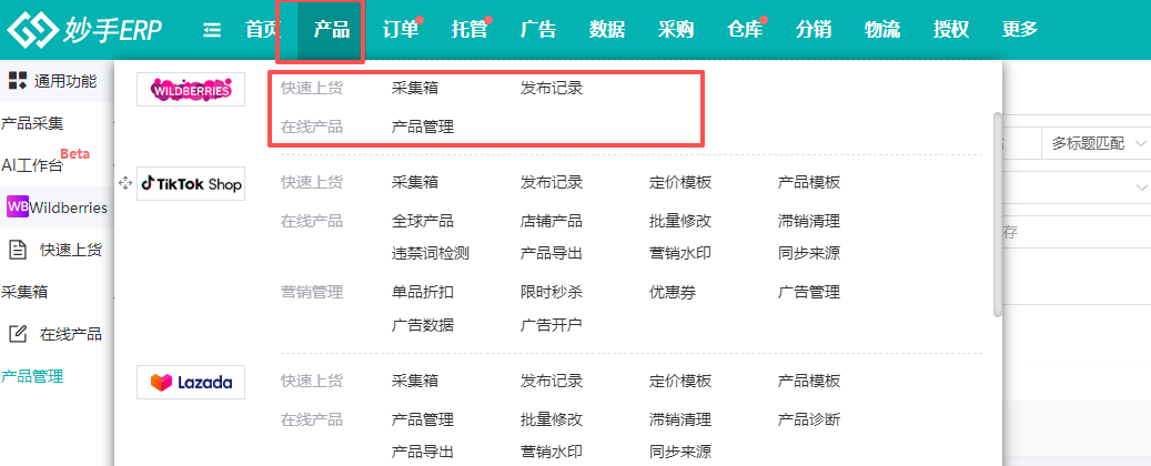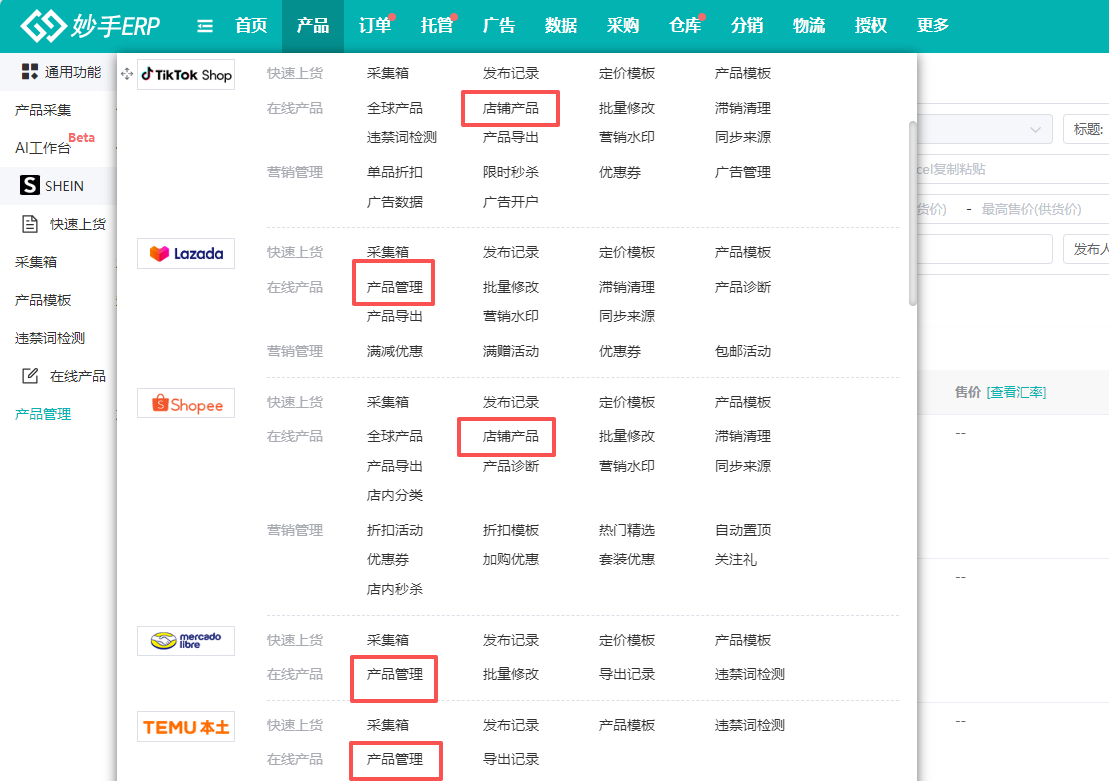 以下图为例,TikTok、Lazada、Shopee这些平台中,有显示“产品导出”功能的即可在功能界面中完成导出,若没有显示“产品导出”的平台则不支持此功能