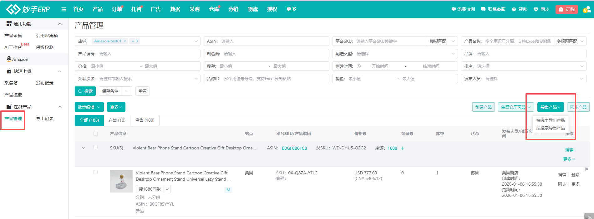以下图亚马逊平台为例,进入在线产品=>产品管理/店铺产品,有显示“导出产品”按钮的,即可使用此功能,若无显示“导出产品”按钮,则不支持