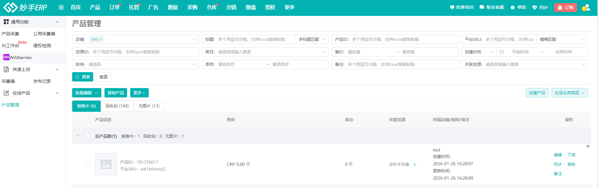 以下图WildBerries平台为例,既无产品导出功能,在线产品的产品管理页面业务“产品导出”按钮的,则表示此平台暂不支持店铺产品导出