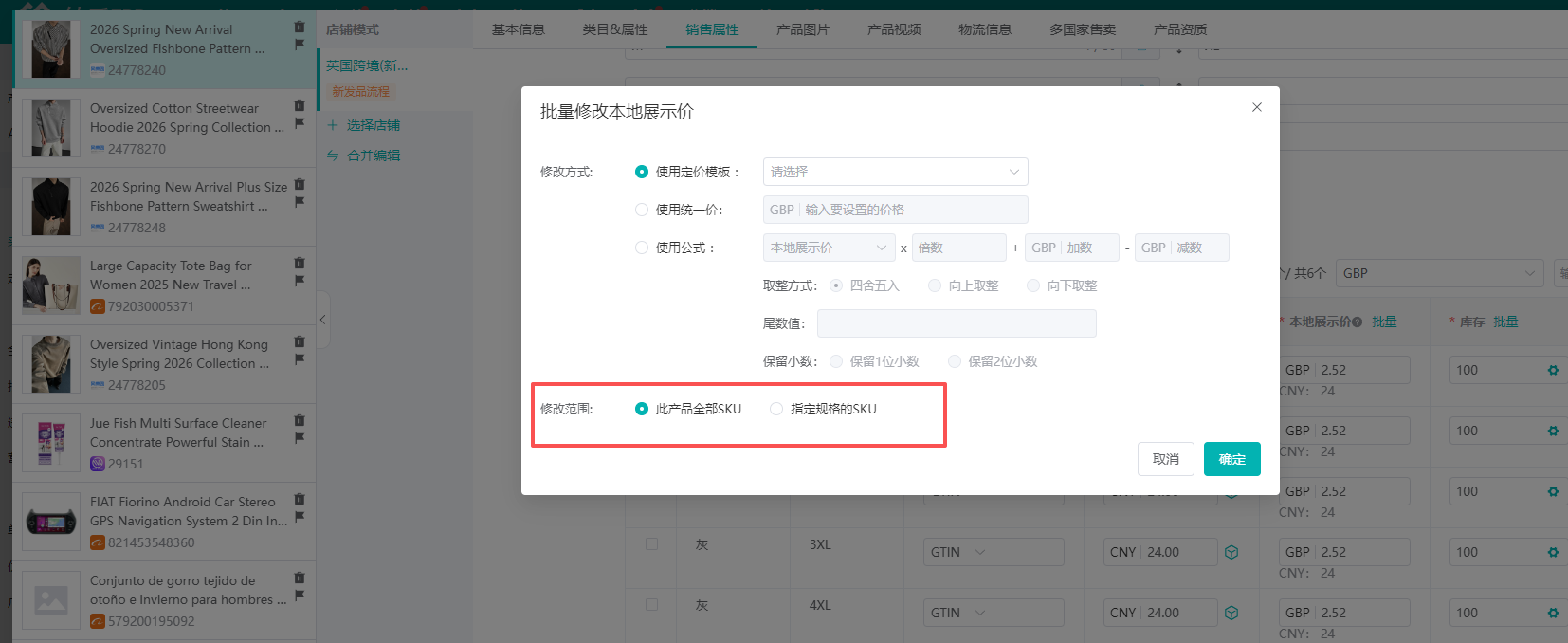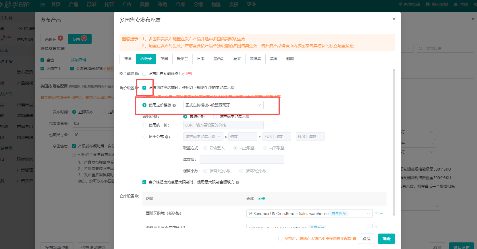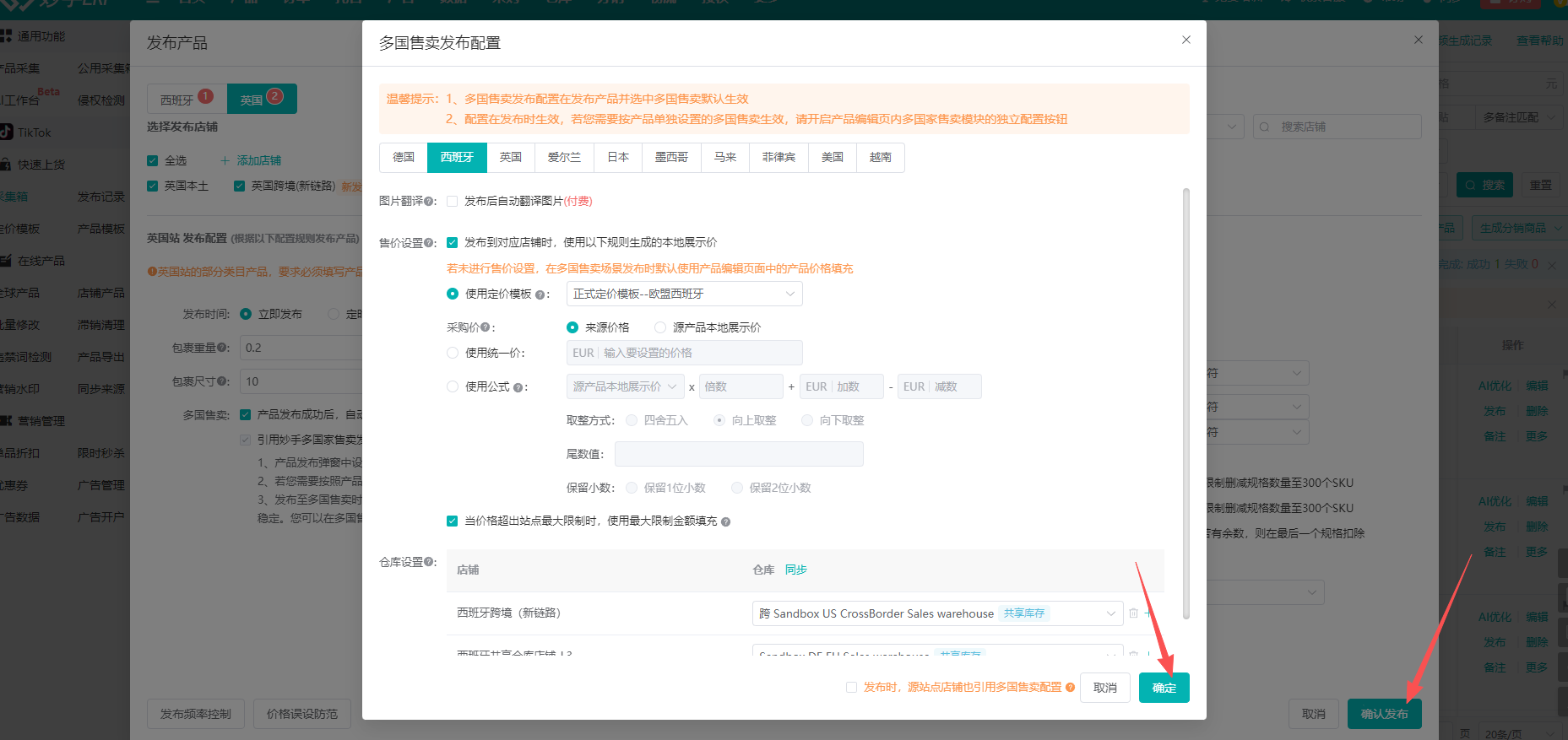 ④设置好之后,点击【确定】=>【确认发布】,关联国家即可引用各自地区的定价模板发布