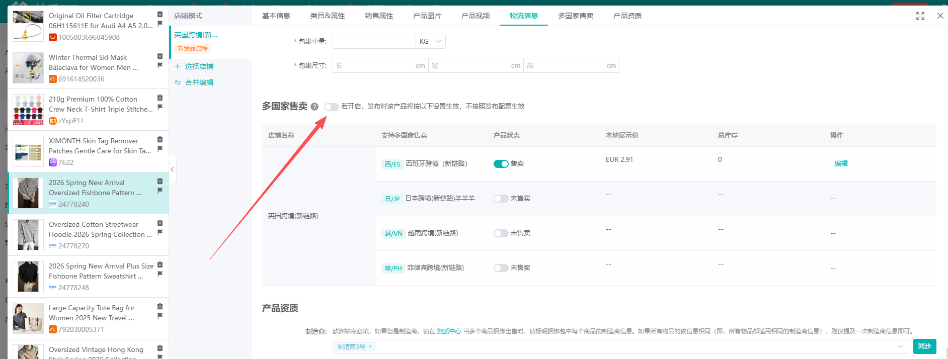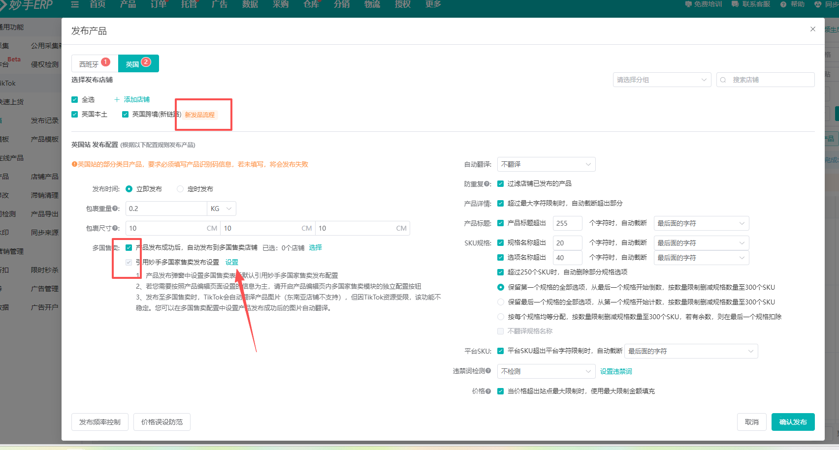 ②弹窗中,切换到新发品链路店铺,并勾选多国售卖,选择需要一起发布的店铺(注意:若同个主体下没有其余店铺则此处不会显示可选店铺,不需要勾多国售卖,可以直接发布)