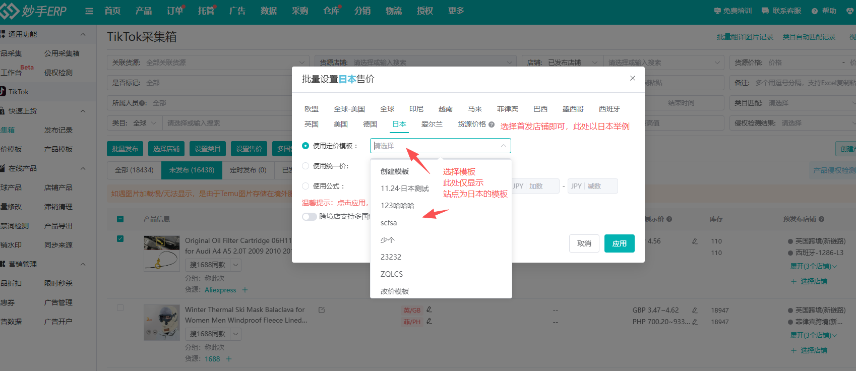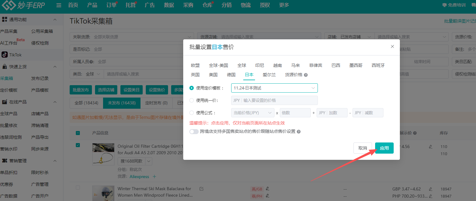 此处只需要设置首发店铺的定价即可,比如首发店铺是日本店,下方弹窗中,点击切换到日本,并选择定价模板,下拉框选择模板;