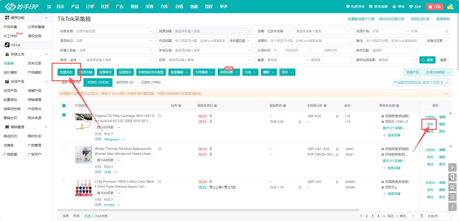 ①回到采集箱,勾选产品,点击【发布】