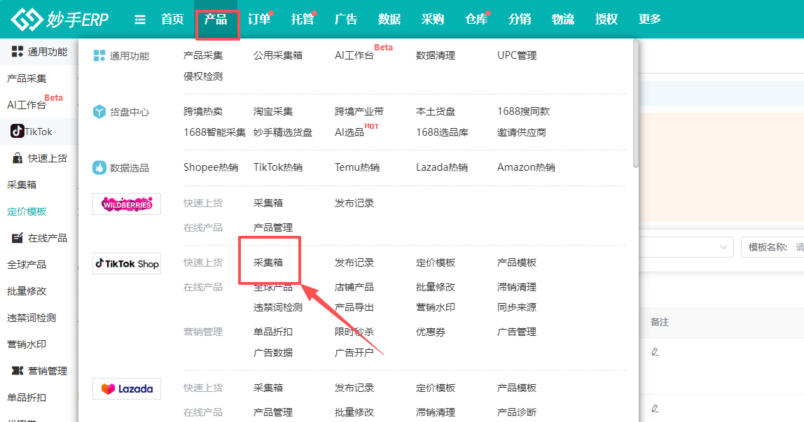 1、进入妙手ERP界面,选择产品=>点击进入TikTok采集箱
