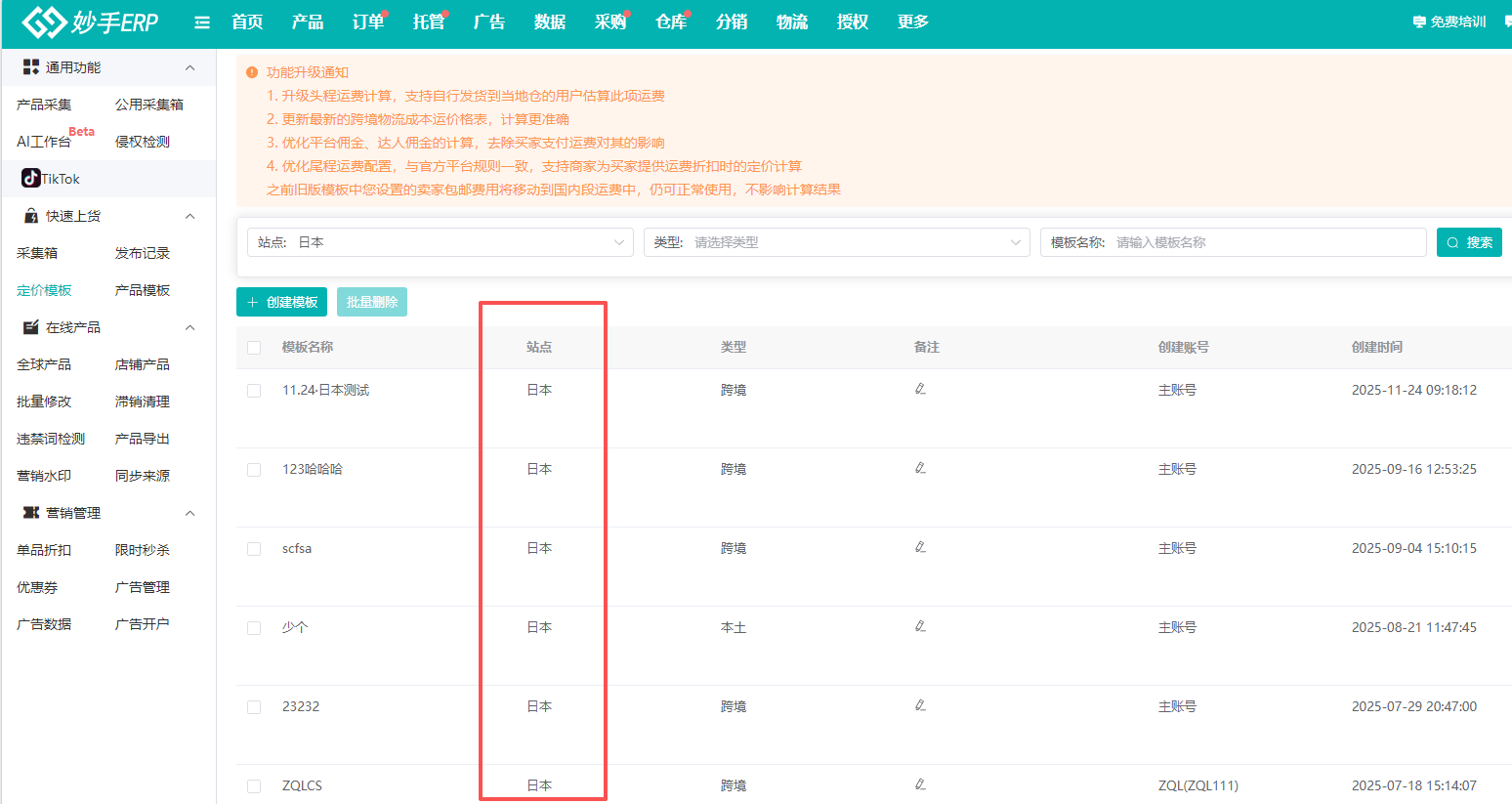 注意,新链路的定价模板,模板的站点要选择具体的国家,比如泰国、日本等,参考跨境店的创建方法即可
