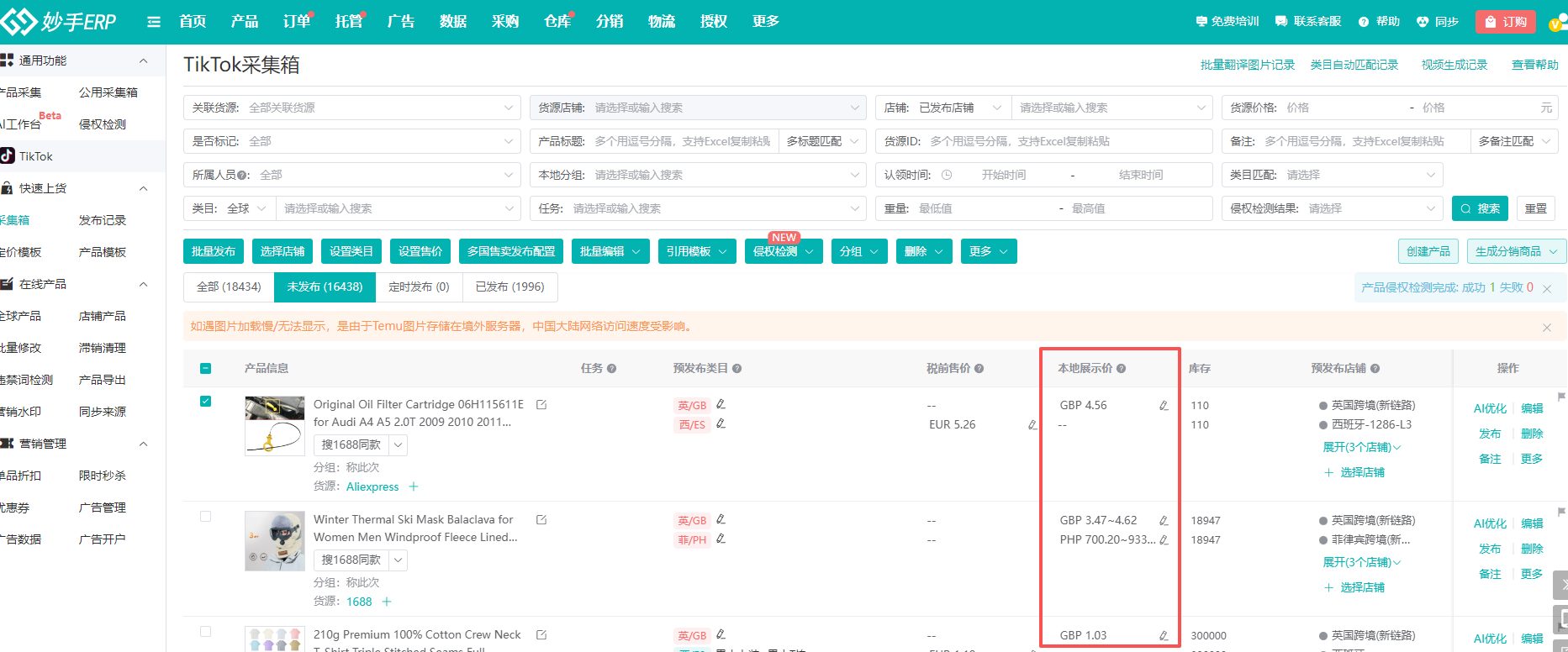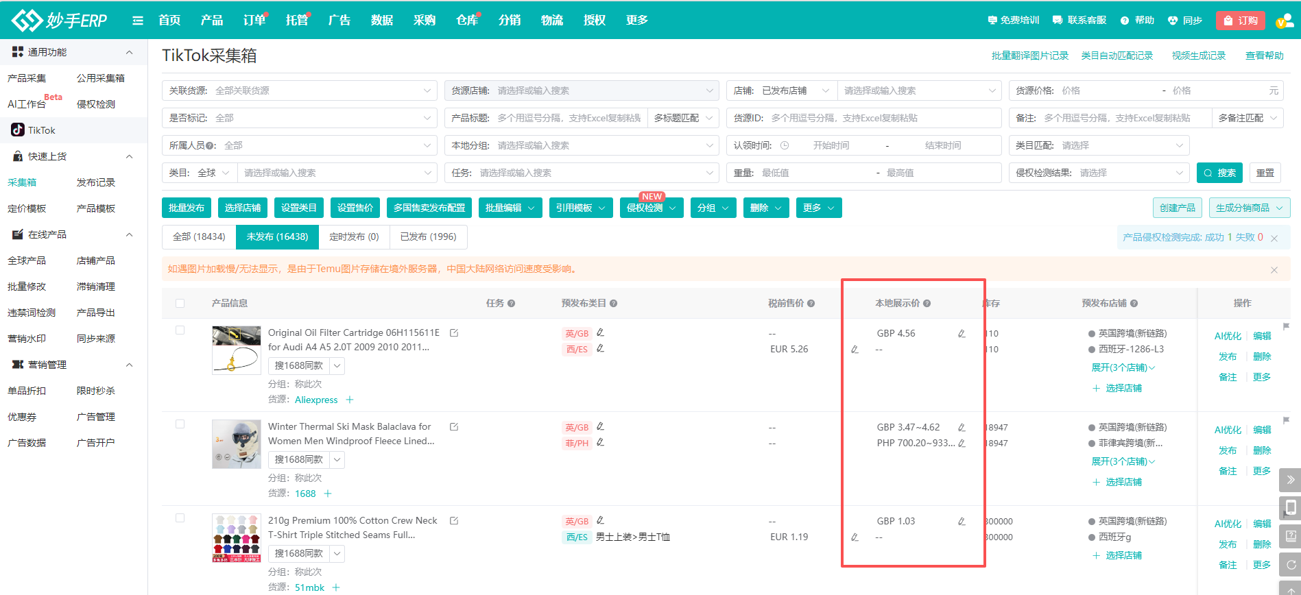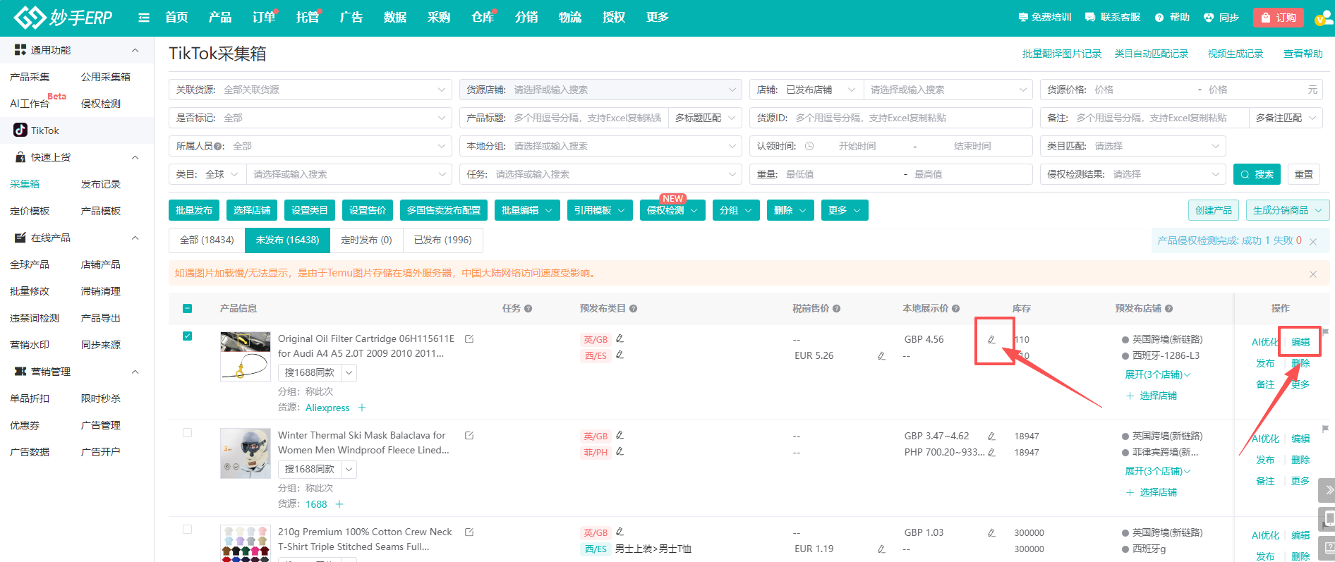 ①TikTok采集箱内,可点击本地展示价列,对应站点右侧的铅笔标识,或者点击产品右侧的【编辑】