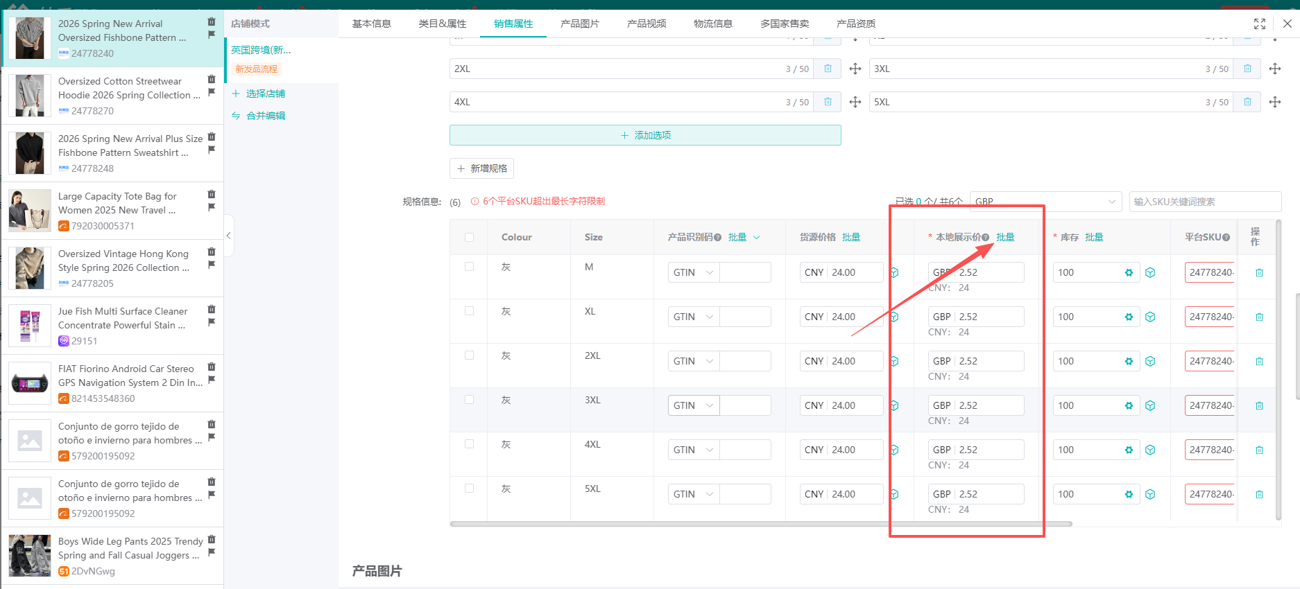 ③往下滑动到SKU列表,在税前售价列,点击箭头指示的【批量】