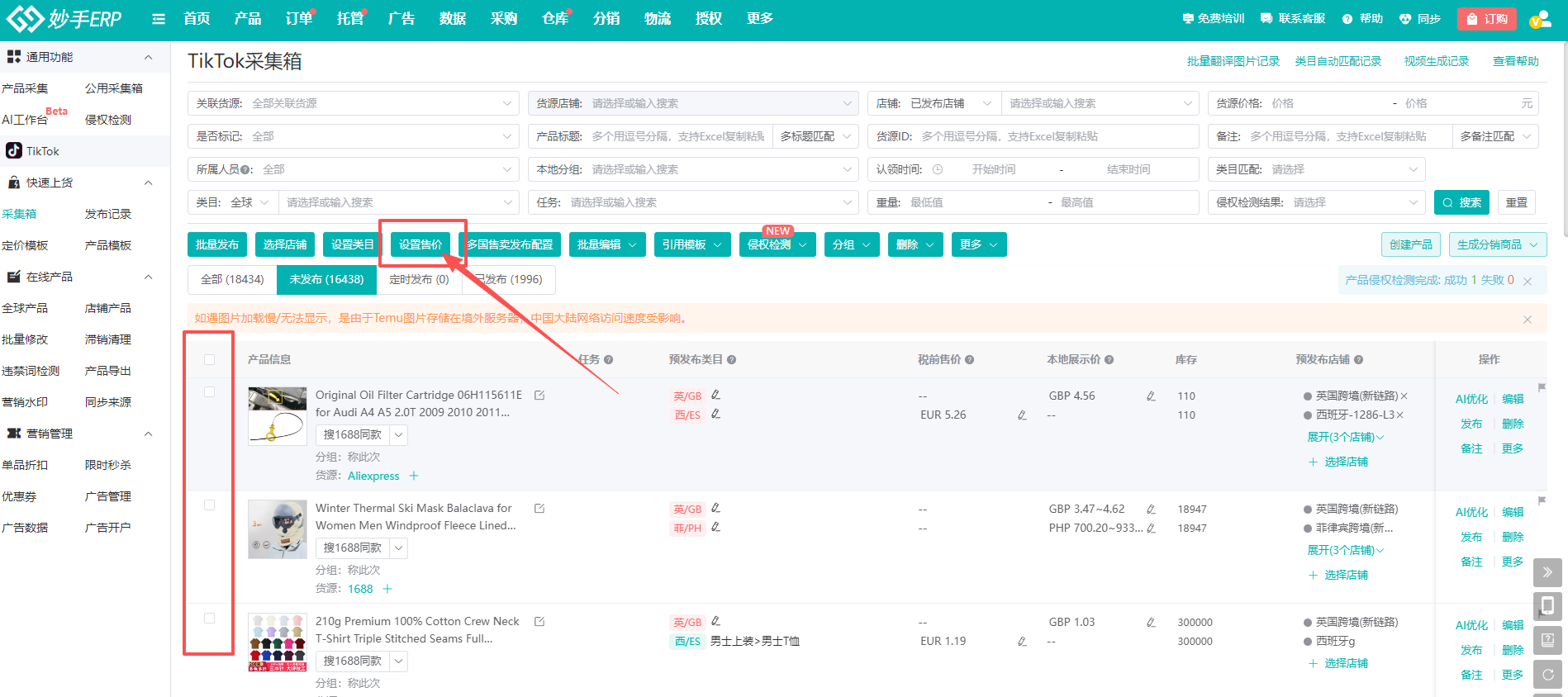 ①勾选需要修改的产品,点击【设置售价】