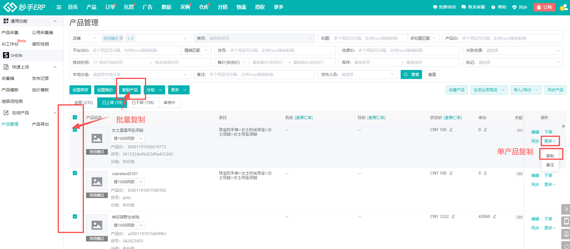 2、勾选需要翻新的产品,点击【复制产品】可批量翻新,或者在产品右侧点击更多=>【复制】,单独翻新