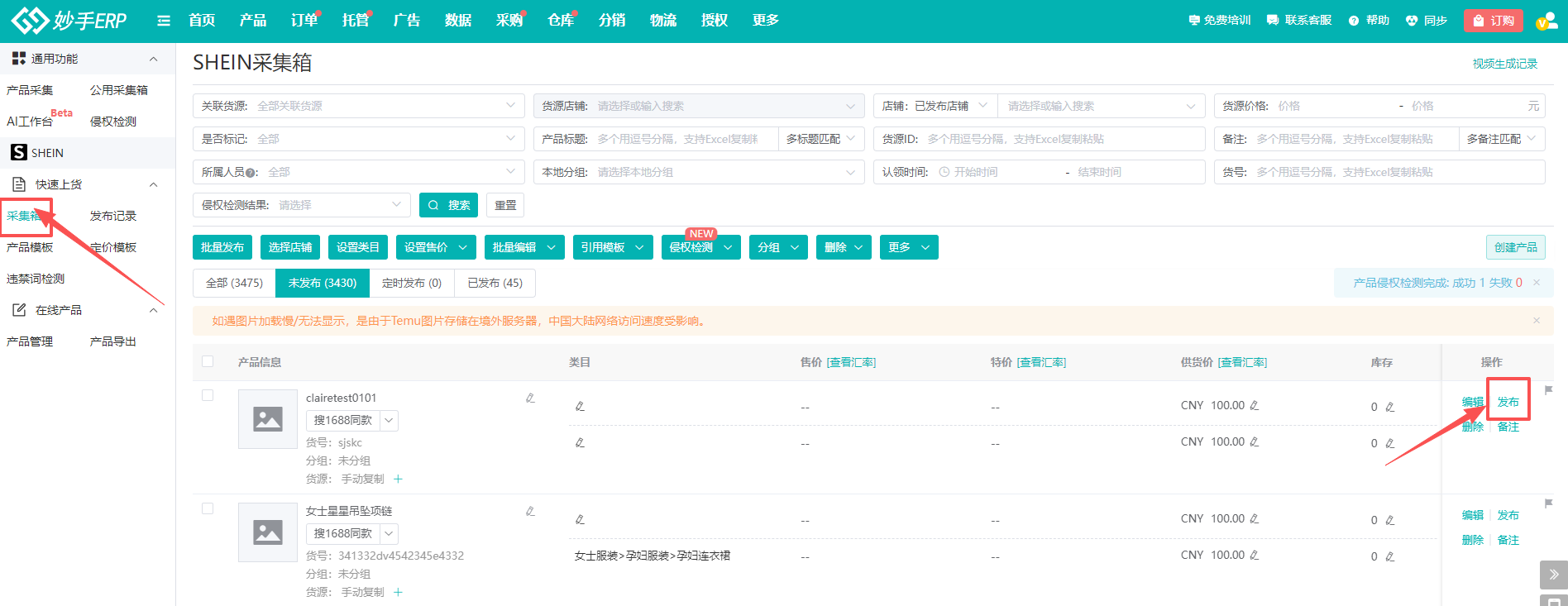 2、目前Shein复制产品仅支持复制到采集箱再发布,以新产品的形式发布