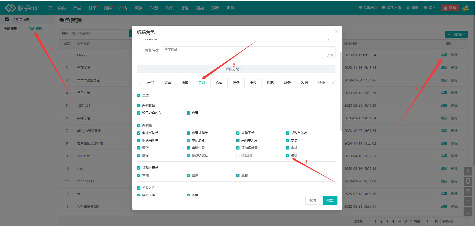 A:子账号-角色管理-采购的权限内,开启编辑权限即可