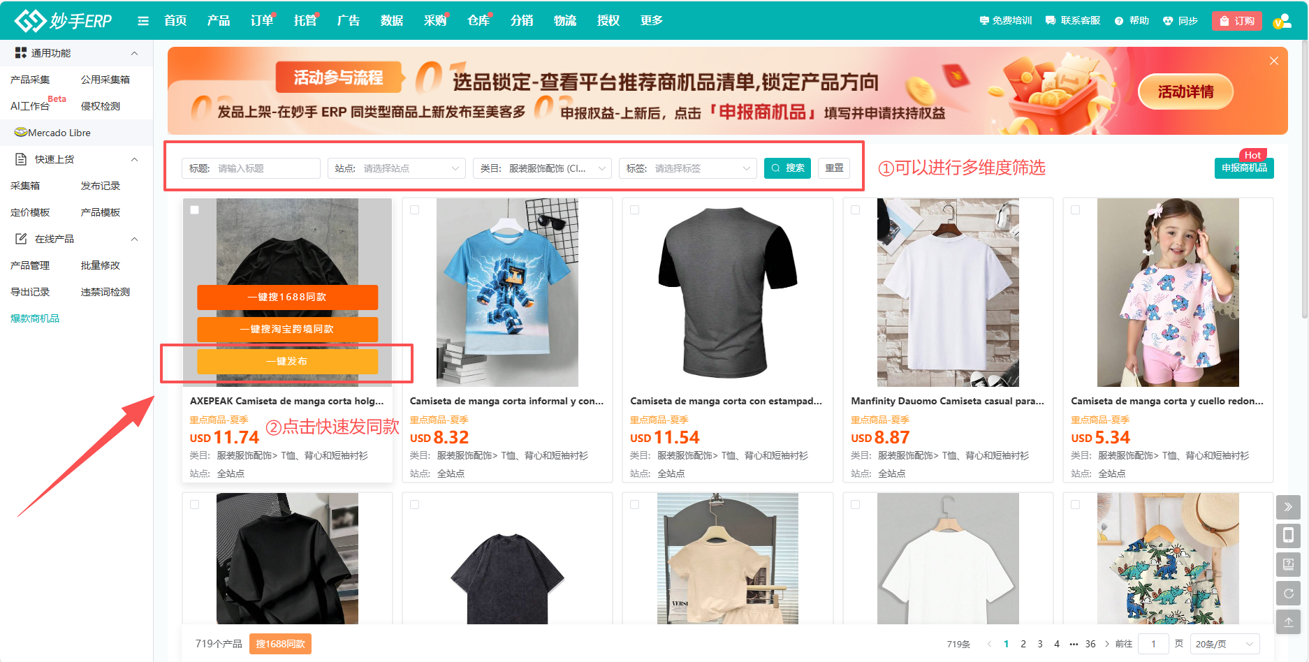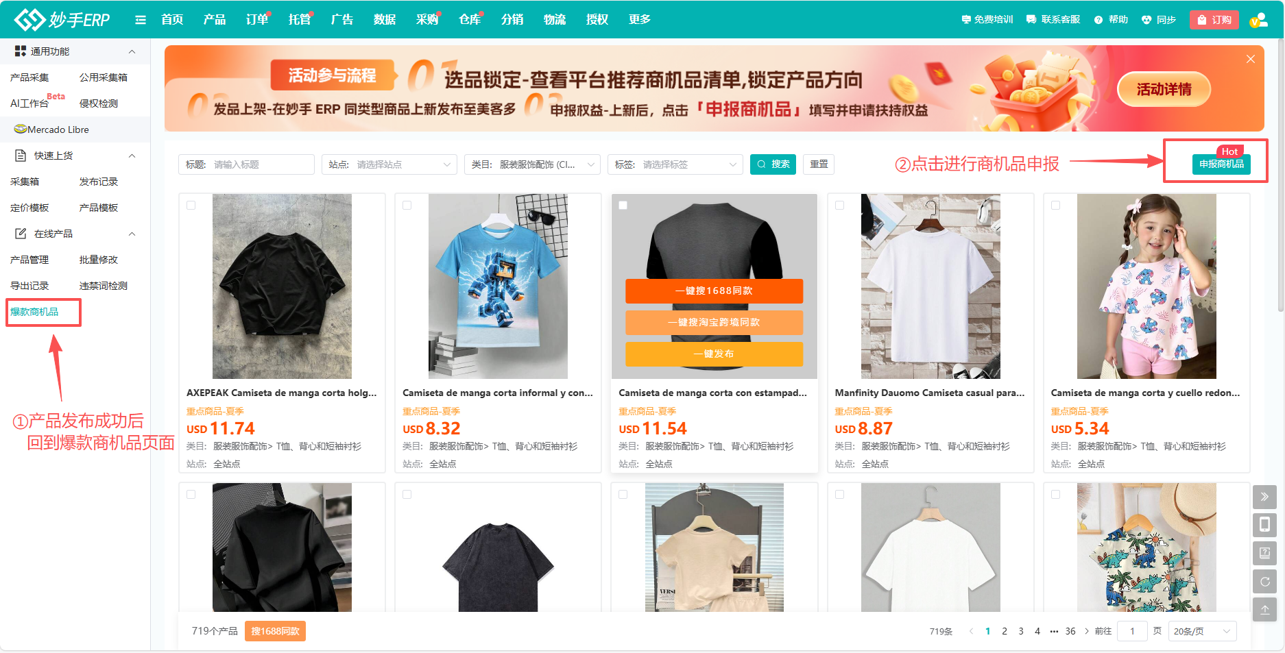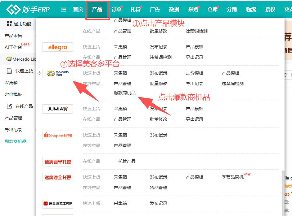 爆款商机品入口:【产品=>美客多平台=>在线产品=>爆款商机品】
