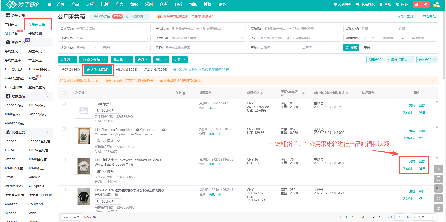 来到公用采集箱,进行产品的编辑,后可以认领到对应的平台采集箱