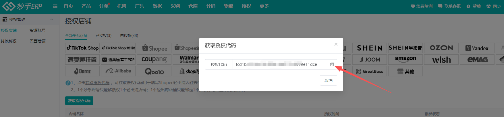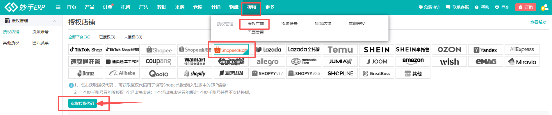 2、登录妙手ERP后,进入授权=>授权店铺=>点击切换到“Shopee轻出海”=>点击【获取授权代码】