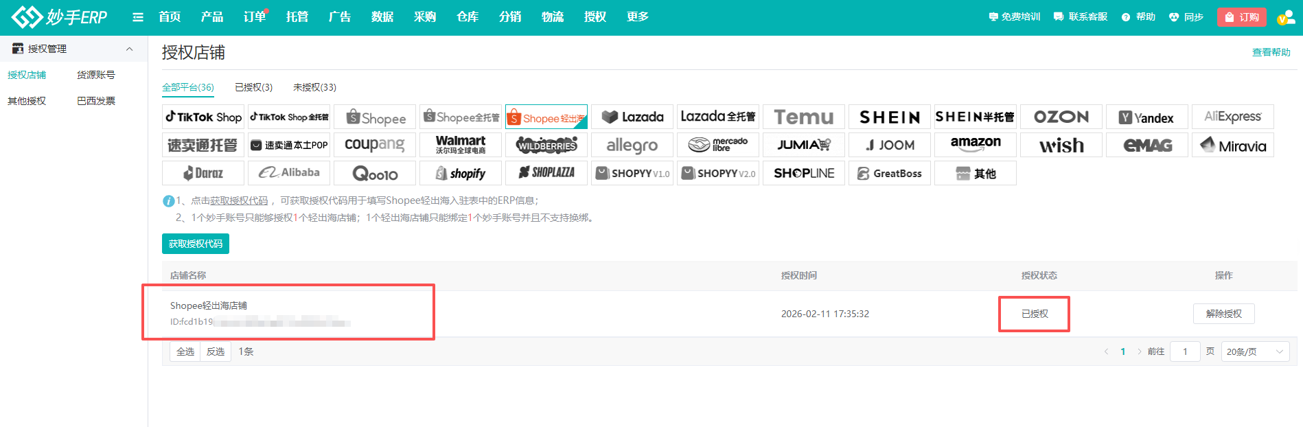 当系统获取到店铺信息后,即可在授权店铺位置查看到Shopee轻出海店铺及授权状态,当授权状态显示:已授权,就表示可以正常使用了