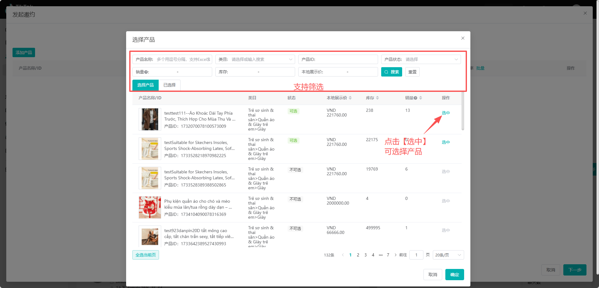 (2)找到需要推广的产品,点击【选中】,选择好之后,点击【确定】