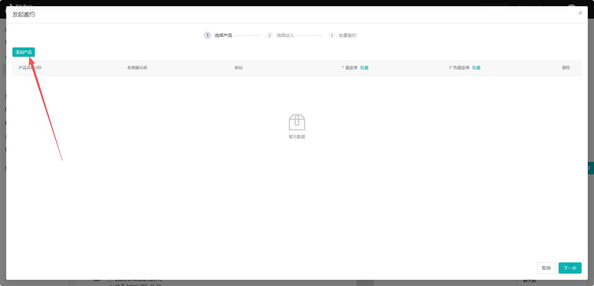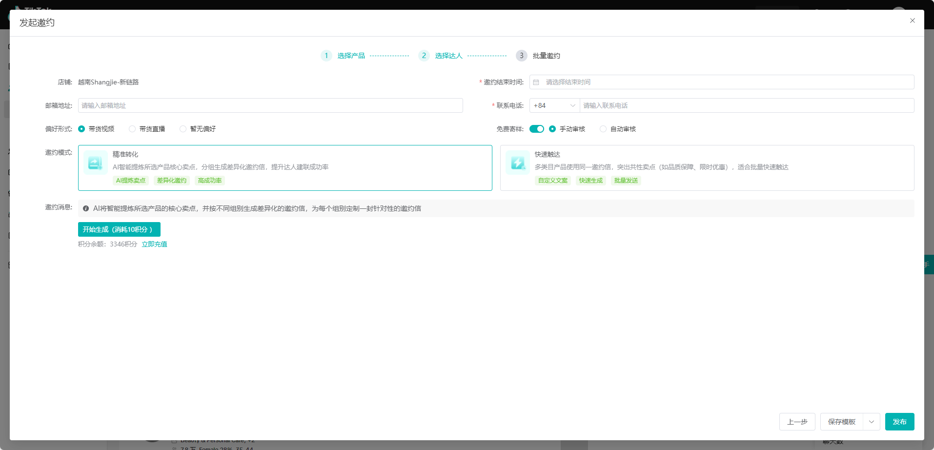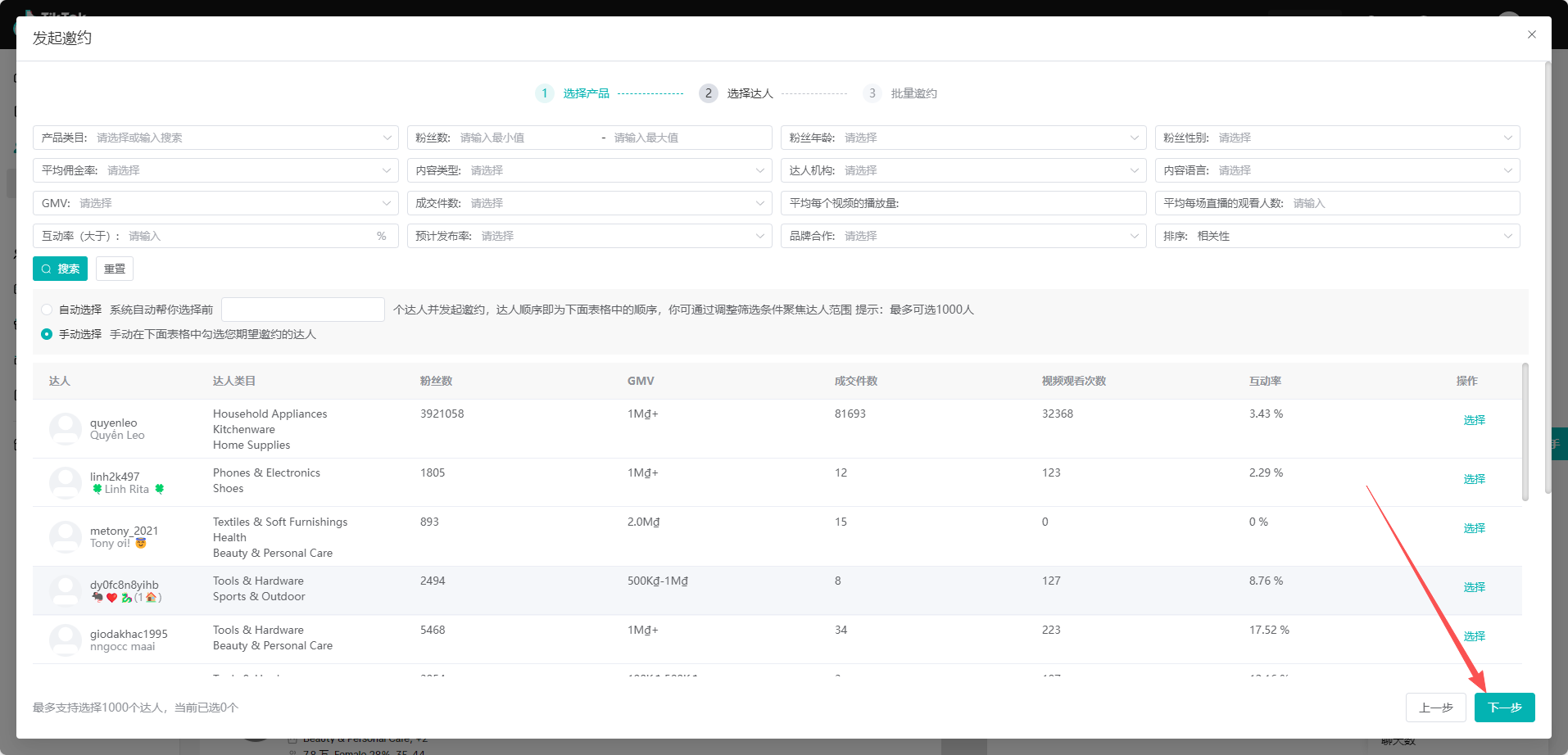 (1)继续选择邀约的达人,支持通过产品类目、粉丝数、内容类型、GMV、互动率、品牌合作等维度精准筛选相匹配的达人,并且支持自动选择/手动选择
