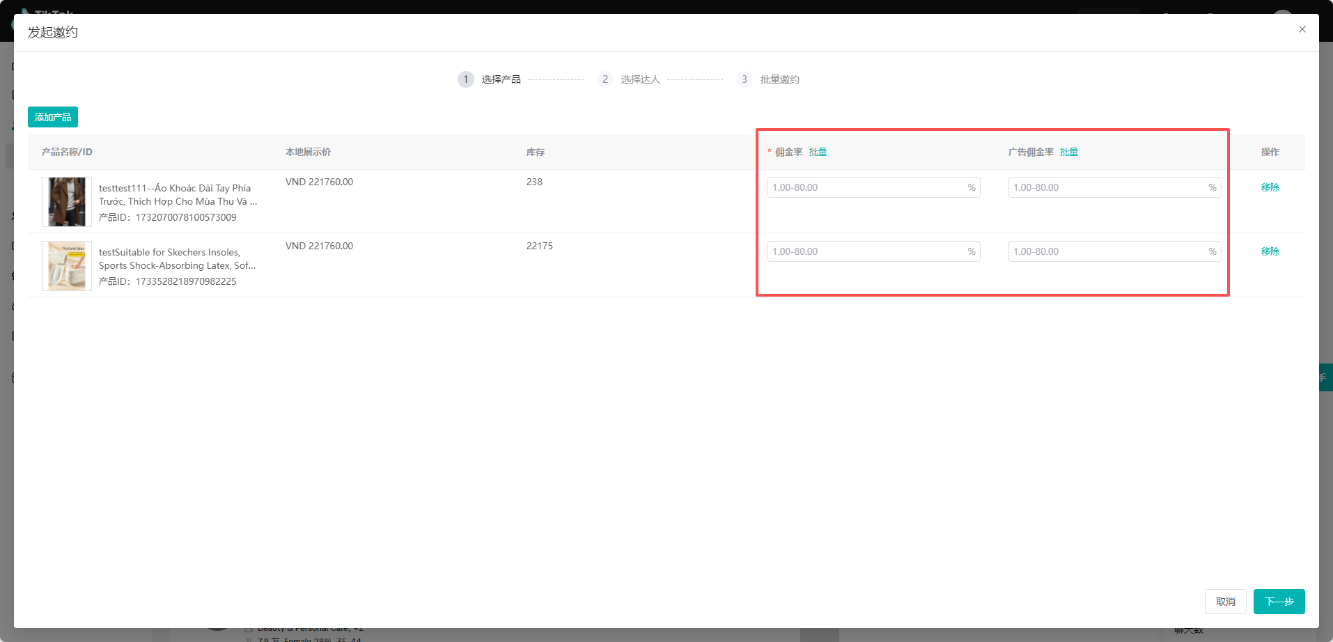 (3)选择产品后,还需要设置佣金率、广告佣金率,支持批量设置,设置好之后,点击【下一步】