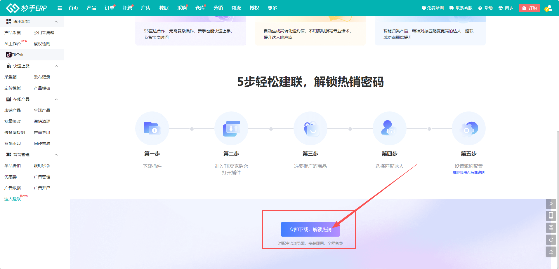 (2)也可以进入妙手ERP=>产品=>达人建联,进入功能界面后,滑动到最下方,点击【立即下载】,即可跳转到查找达人页面