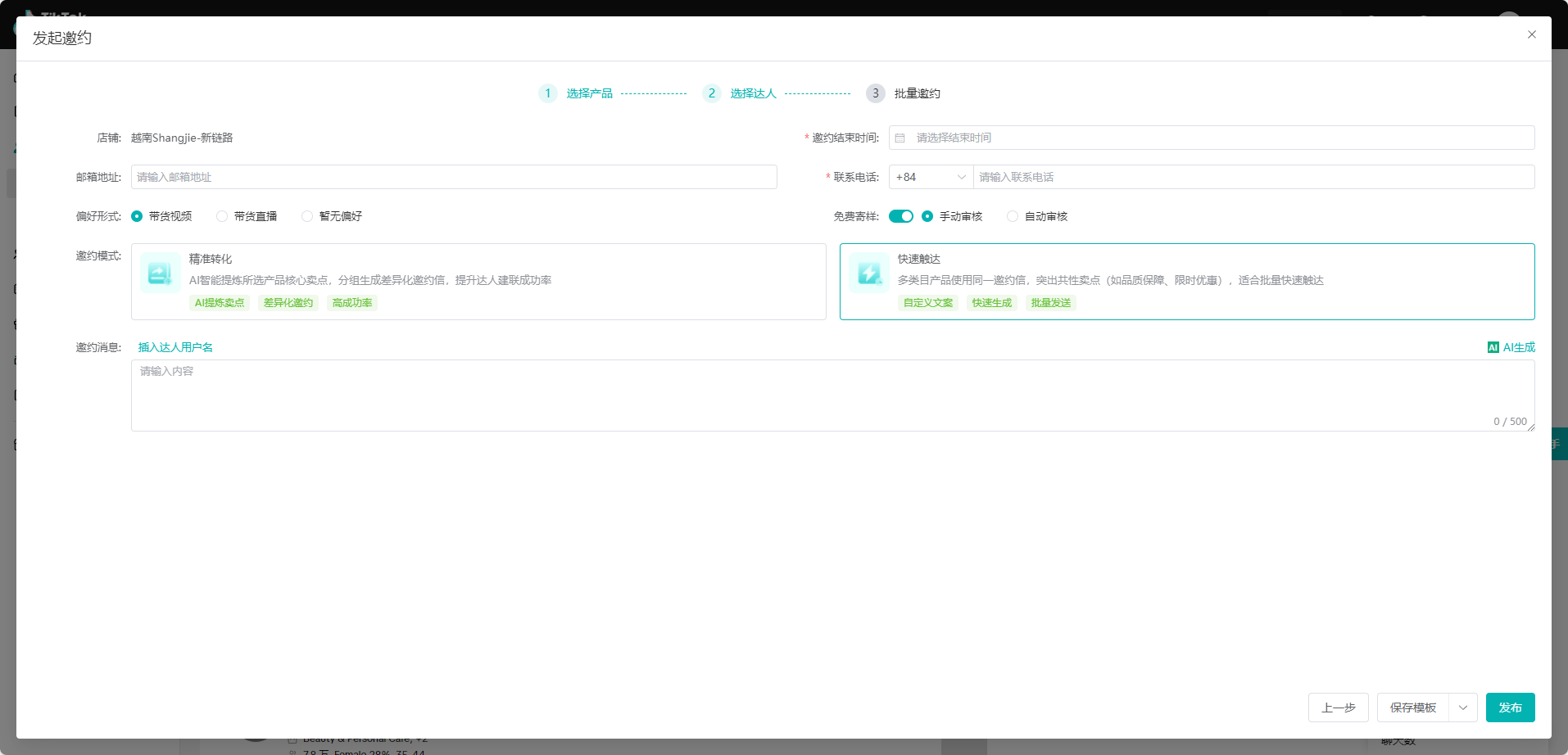 邀约模式支持精准转化和快速触达,精准转化支持AI智能提炼核心卖点,如需自定义输入文案,可选择使用快速触达