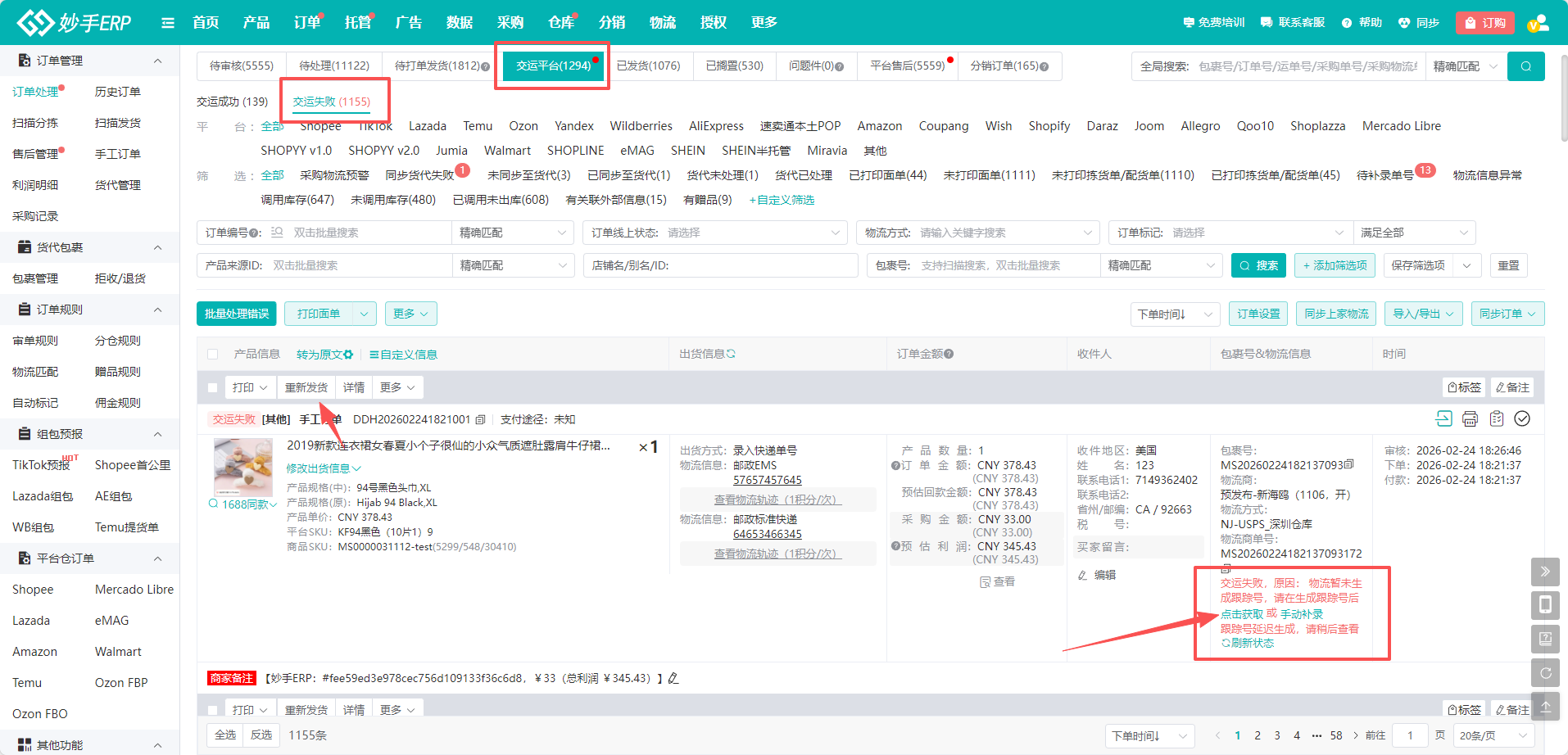 2、如果交运失败,可在订单状态中查看失败原因,重新发货