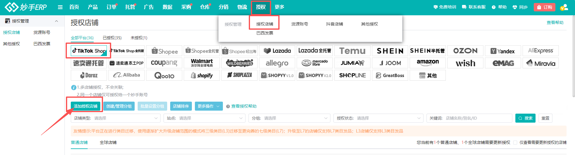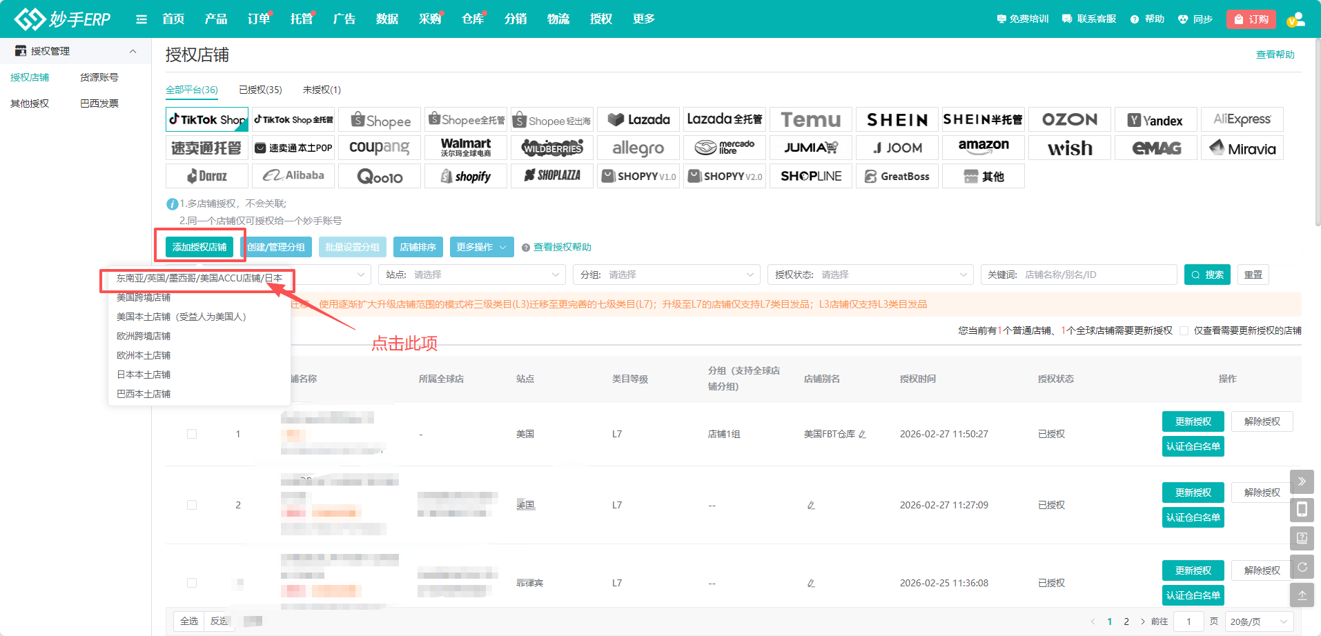 1、登录妙手=>授权=>选择TikTok=>点击【添加授权店铺】,选择东南亚/英国/墨西哥/英国ACCU店铺选项