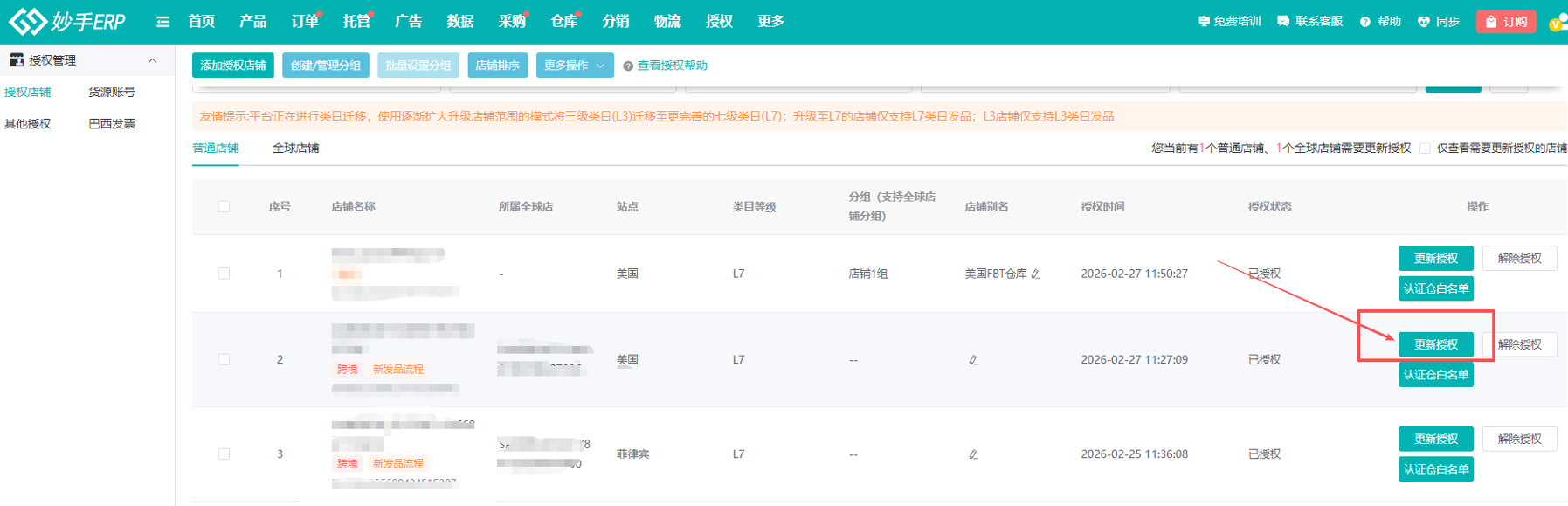 5、授权成功后,会返回到妙手ERP,授权状态显示“已授权”就表示授权成功了