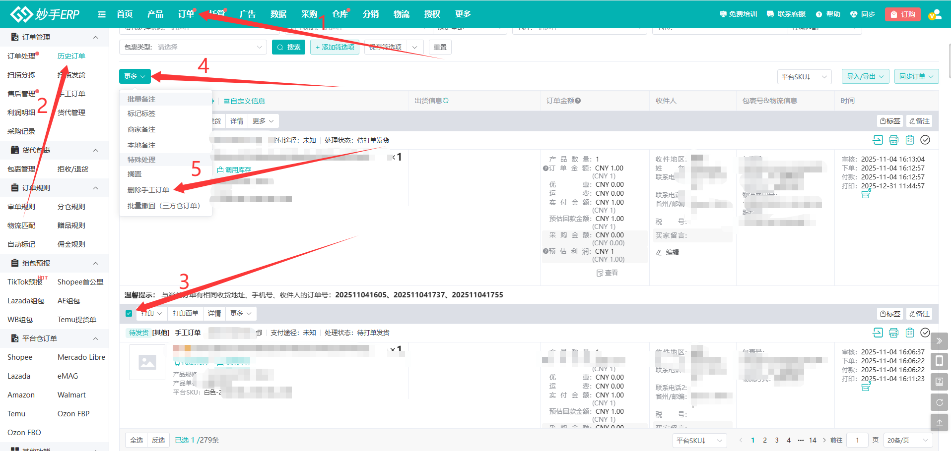 A:可以,在订单-历史订单,选择要删除的手工订单,点击更多-删除手工订单