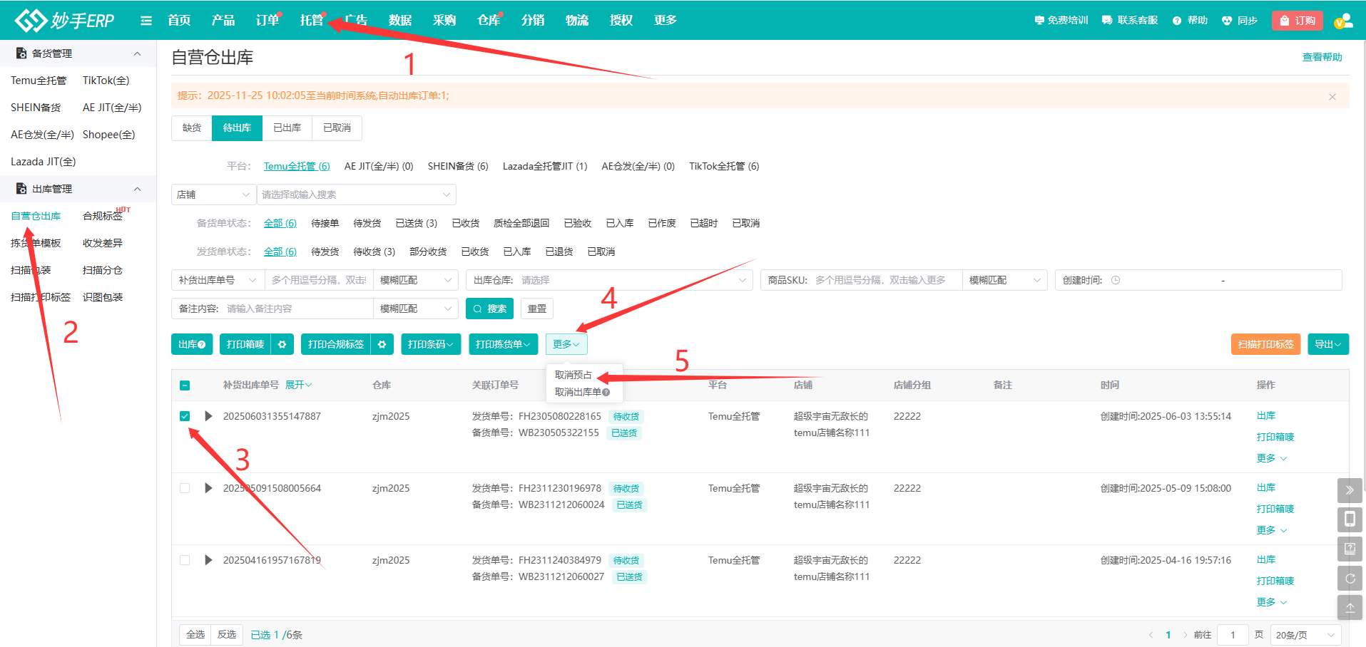 A:托管-自营仓出库-找到对应预占的单号,更多-取消预占