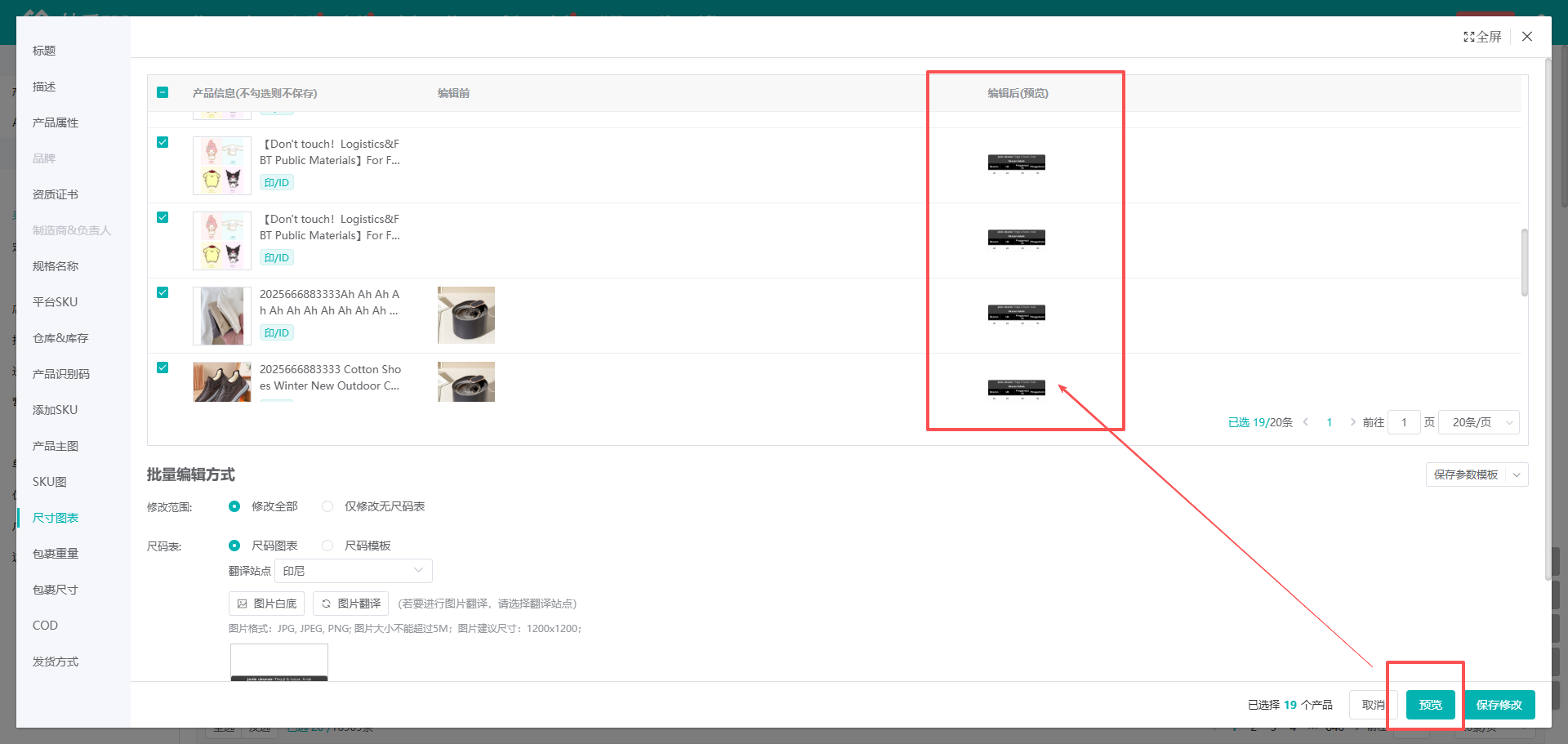 (3)设置好尺码表之后,点击【预览】,查看编辑后的尺码表情况