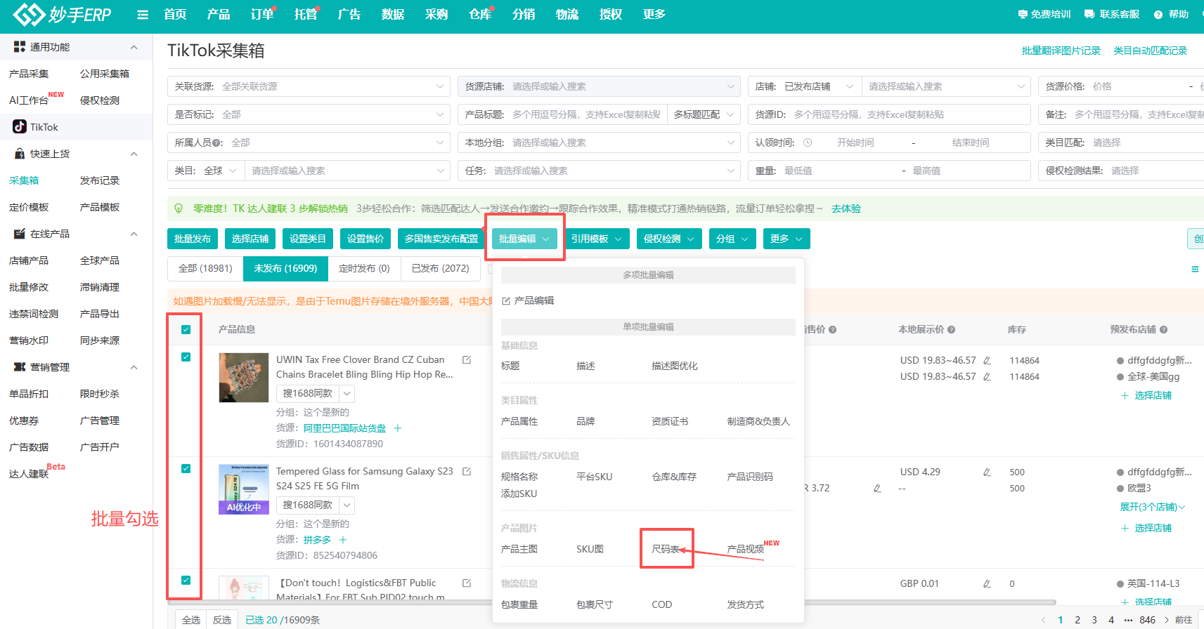 (1)在采集箱中,勾选需要设置尺码表的产品,点击批量编辑=>尺码表