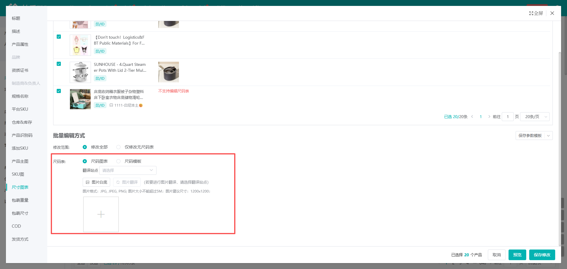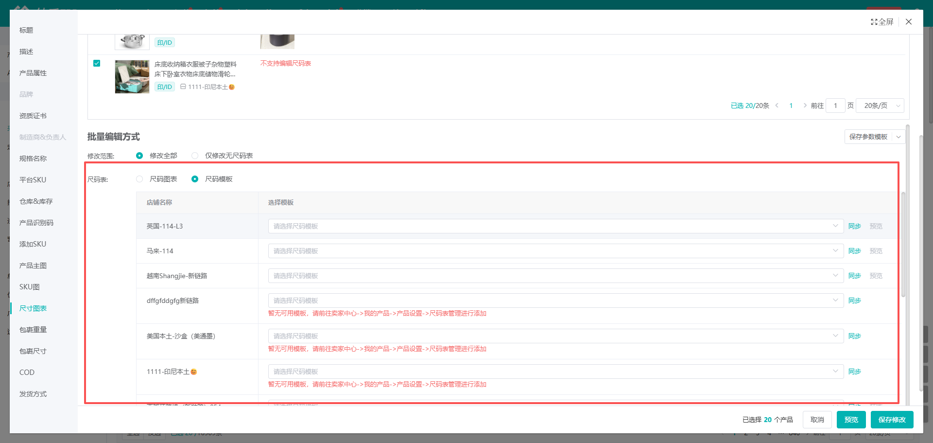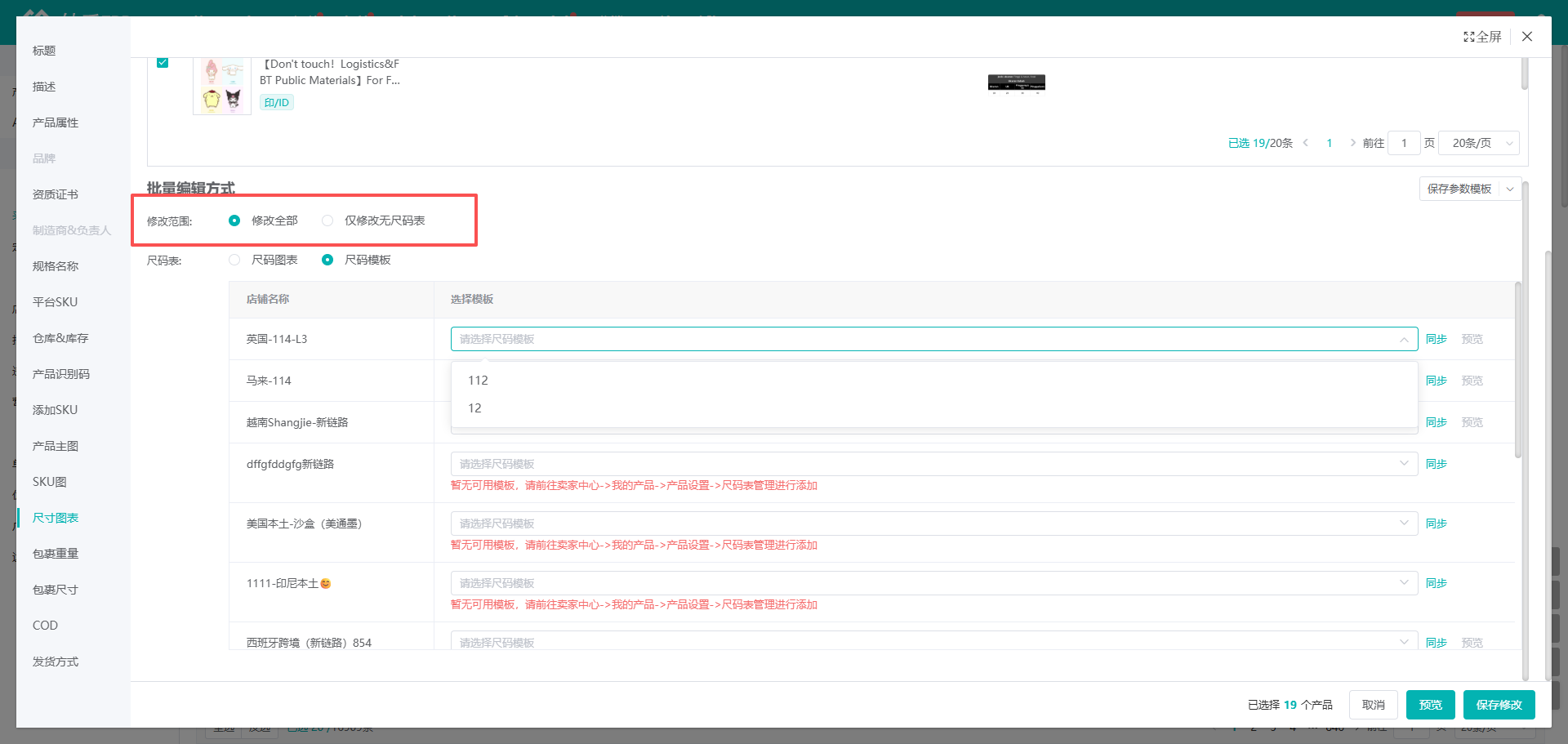(2)在弹窗中可设置修改尺码表,根据情况选择修改全部/仅修改无尺码表