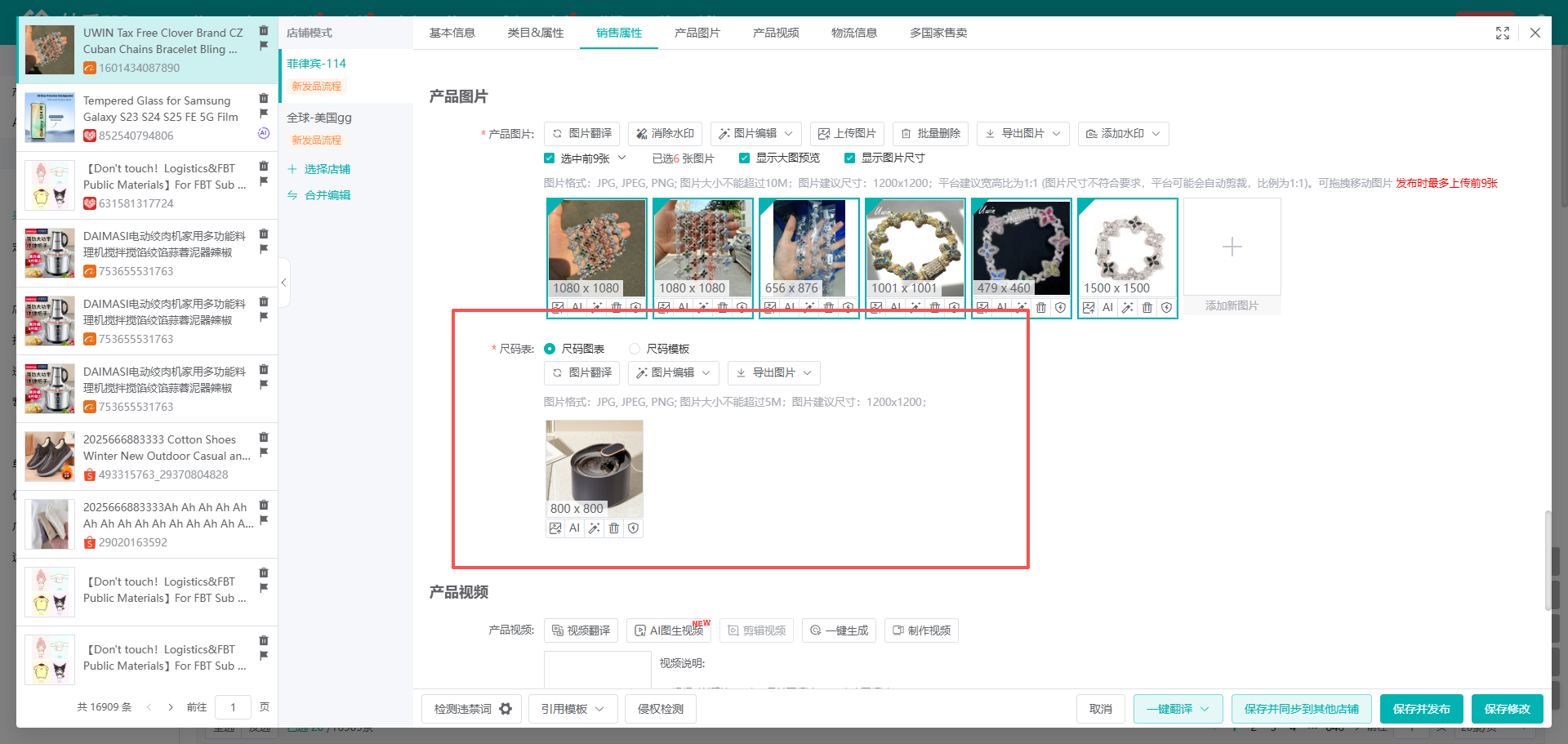 2、设置尺码表支持批量操作和单产品操作