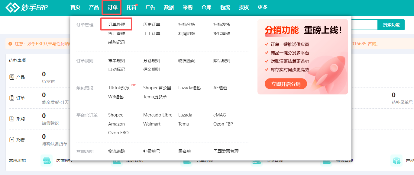 1、进入妙手ERP=>订单=>订单处理