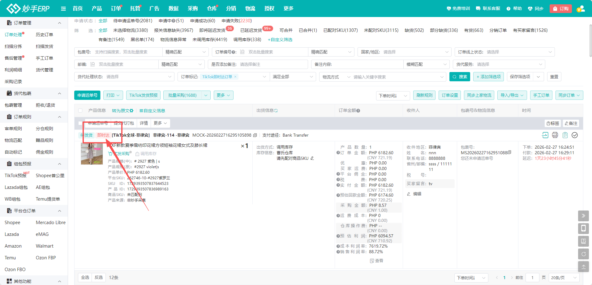 (1)在待处理状态下,筛选订单标记=>TikTok即时达订单,如果没有显示此筛选框,可点击【添加筛选项】自行添加