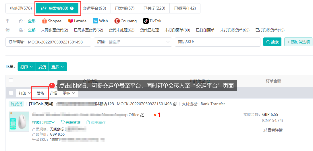 (3)之后在待打单发货界面,点击【发货】,订单进入交运平台