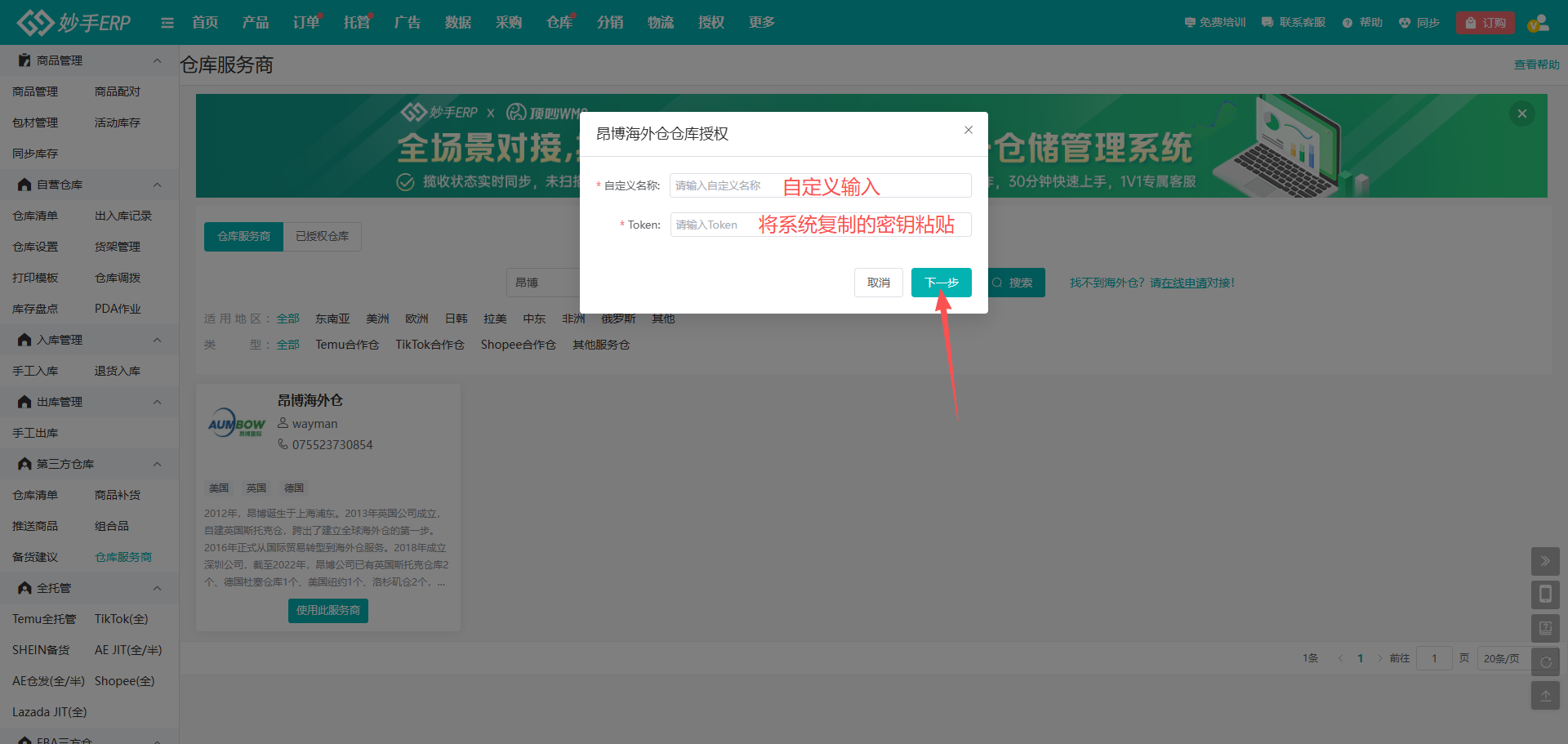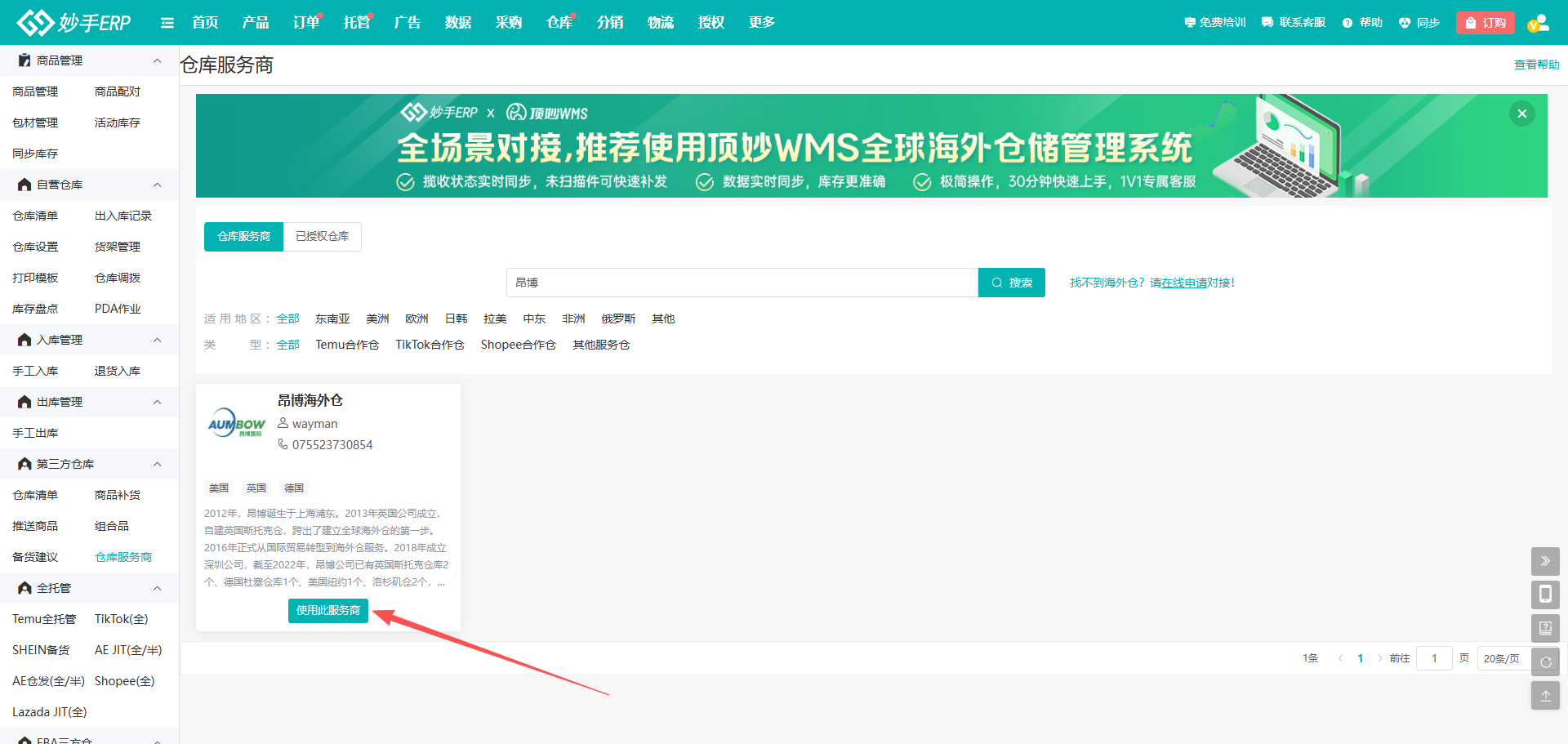 4、找到使用易境通系统的海外仓,操作流程一致,下方教程以昂博海外仓做案例演示