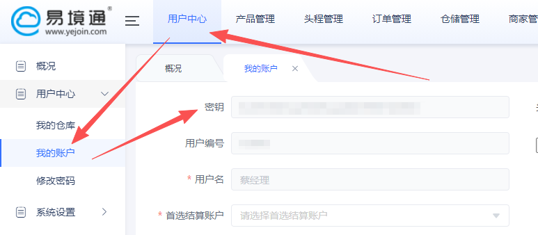 2、进入系统后,点击进入用户中心=>我的账户,找到密钥,并复制密钥到妙手ERP
