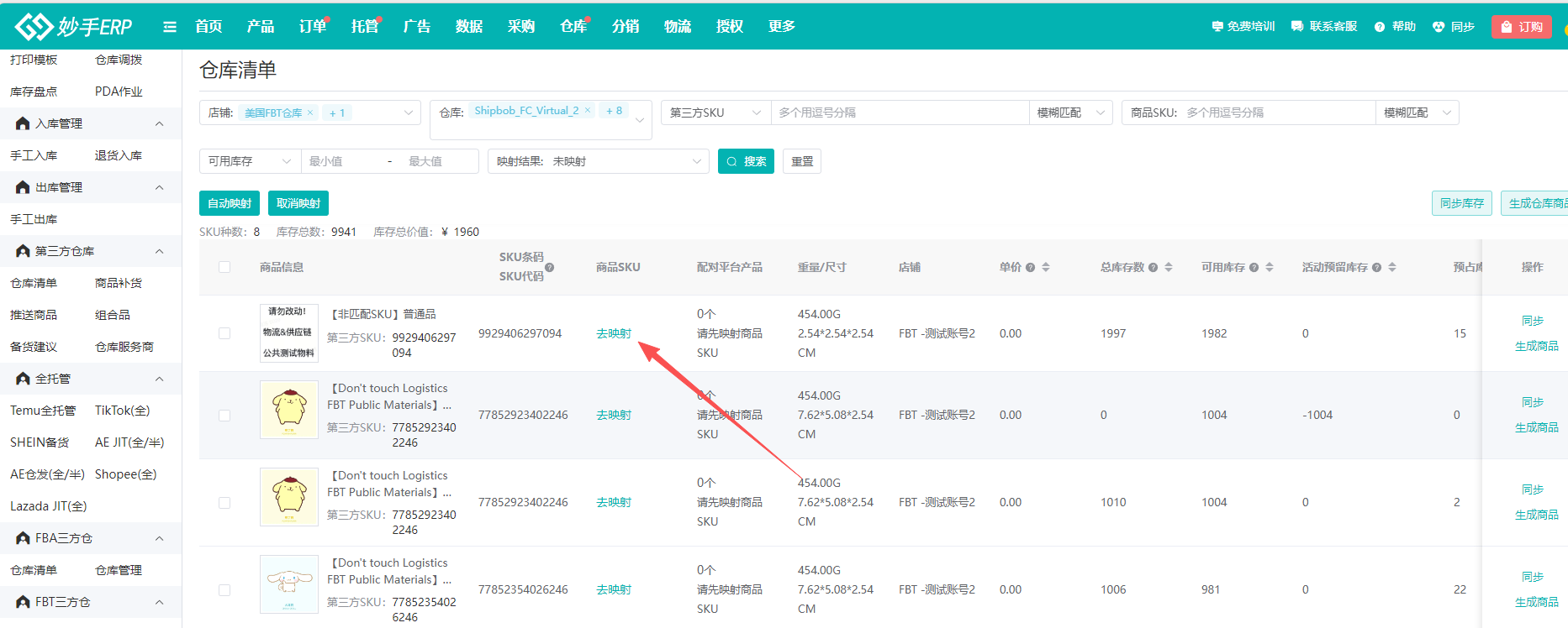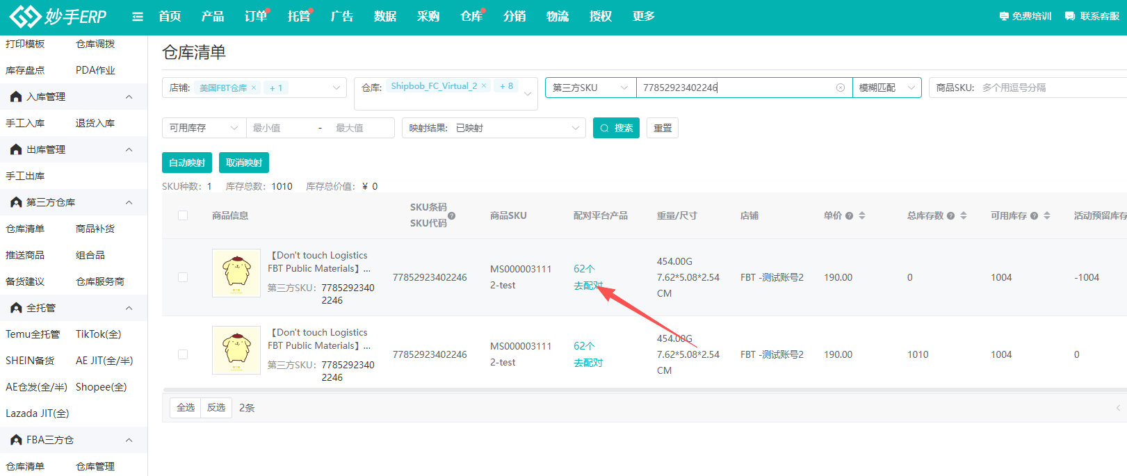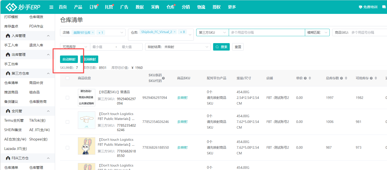 (2)FBT的商品,需要与妙手ERP商品管理中的商品进行映射,后续在处理订单时,才能调用FBT库存发货