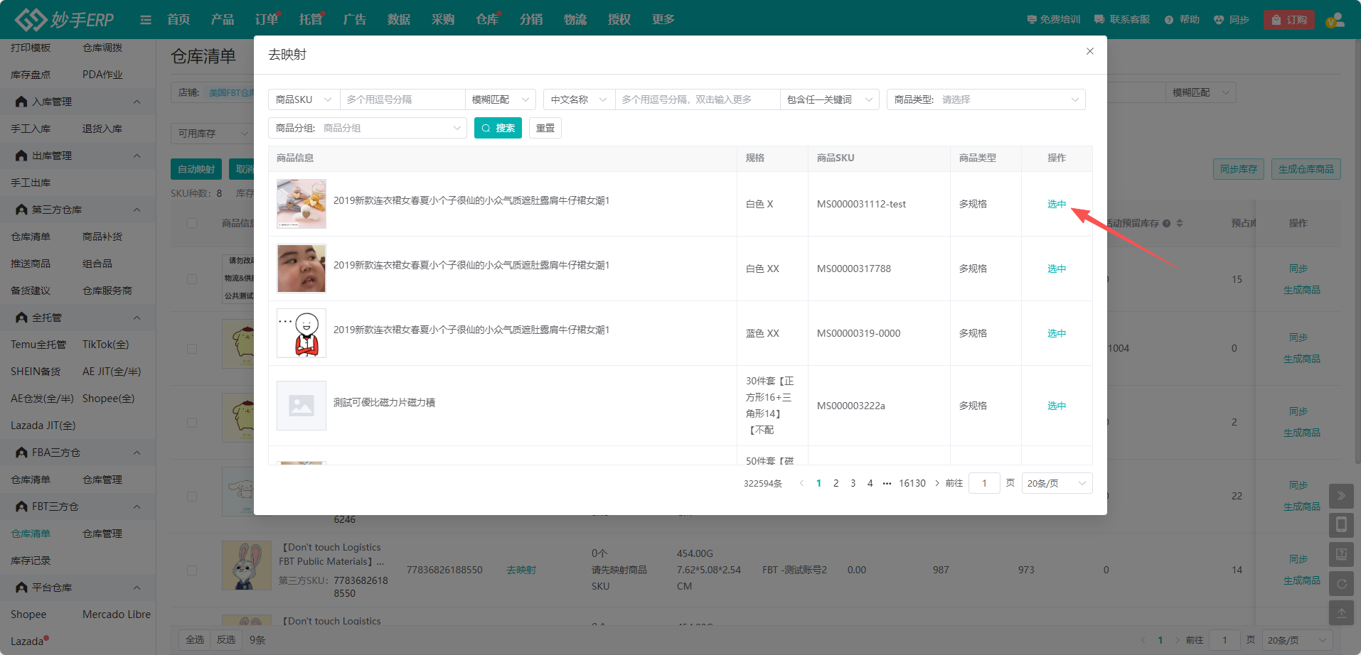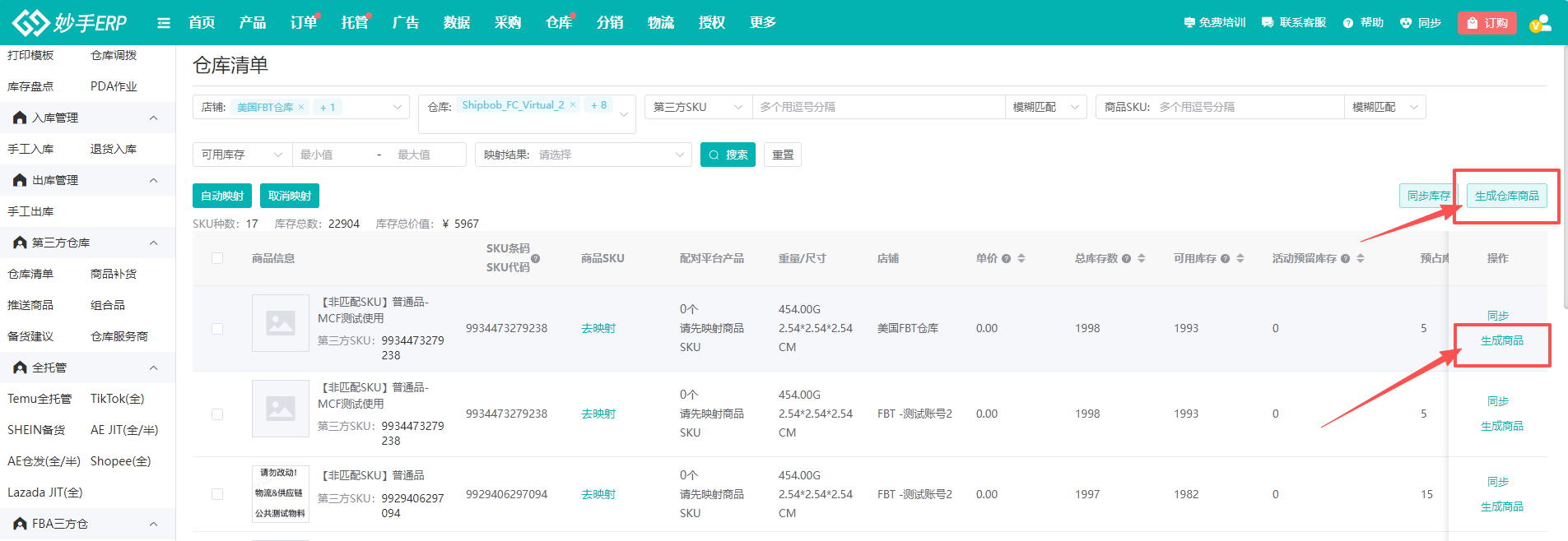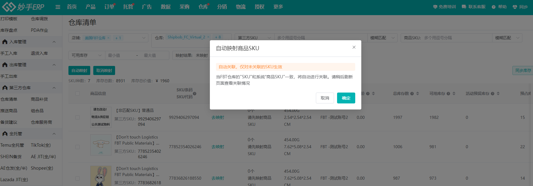 (2)FBT的商品,需要与妙手ERP商品管理中的商品进行映射,后续在处理订单时,才能调用FBT库存发货