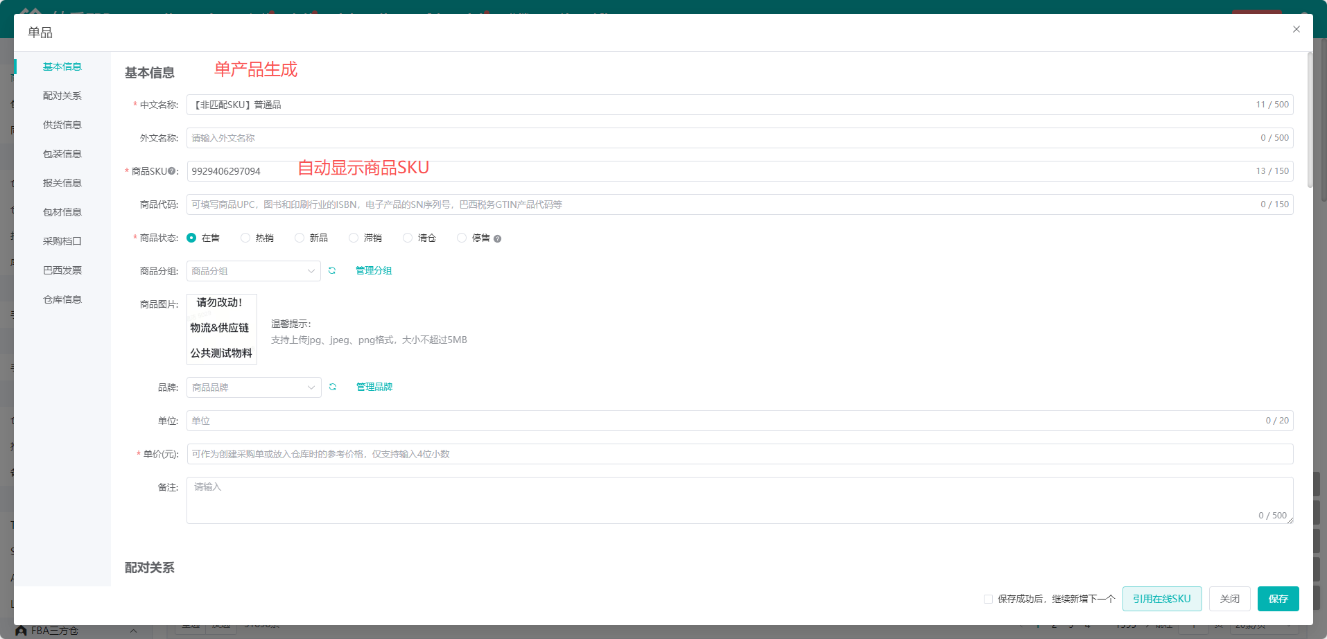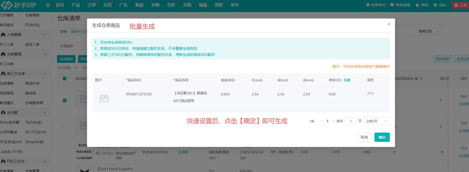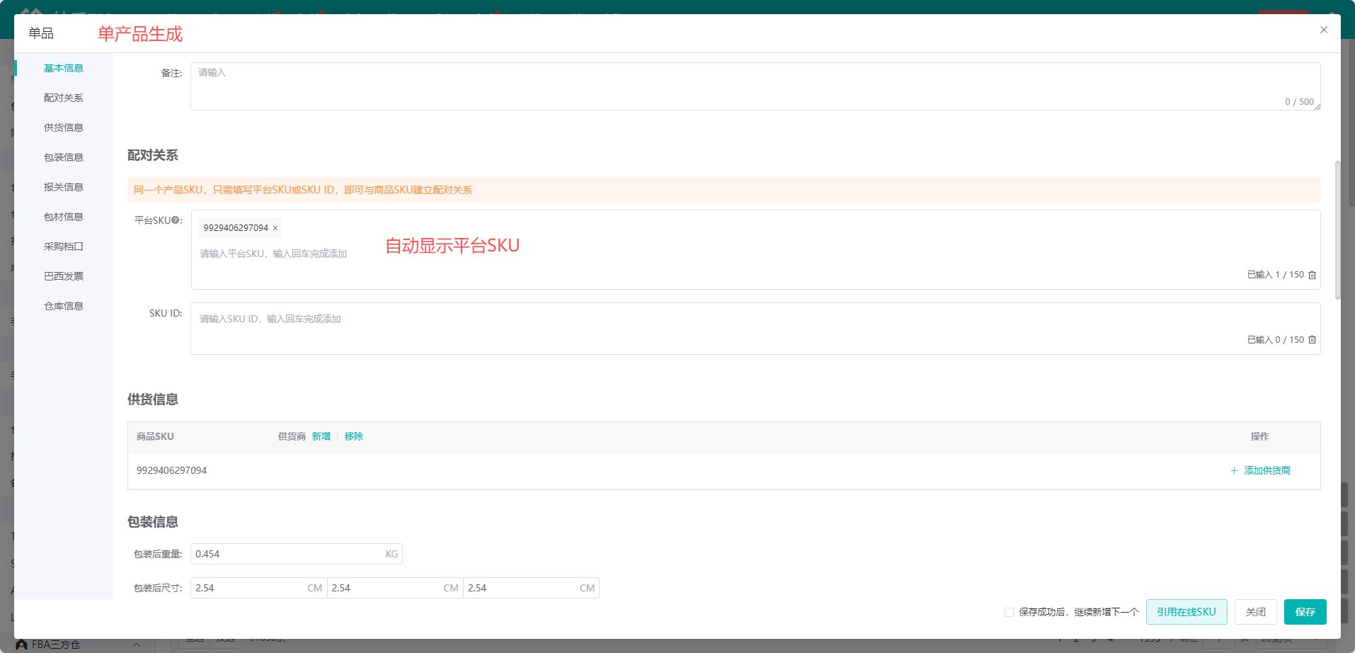 (3)在弹窗中创建商品,如果是在仓库清单直接生成商品,系统会默认生成与第三方SKU一致的商品SKU、平台SKU,并自动映射商品SKU、第三方SKU、平台SKU,