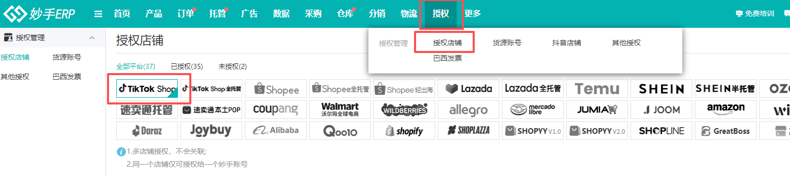 进入妙手ERP,点击进入系统=>授权店铺,TikTok店铺授权流程,具体操作流程可跳转查看:TikTok跨境店、本土店授权教程