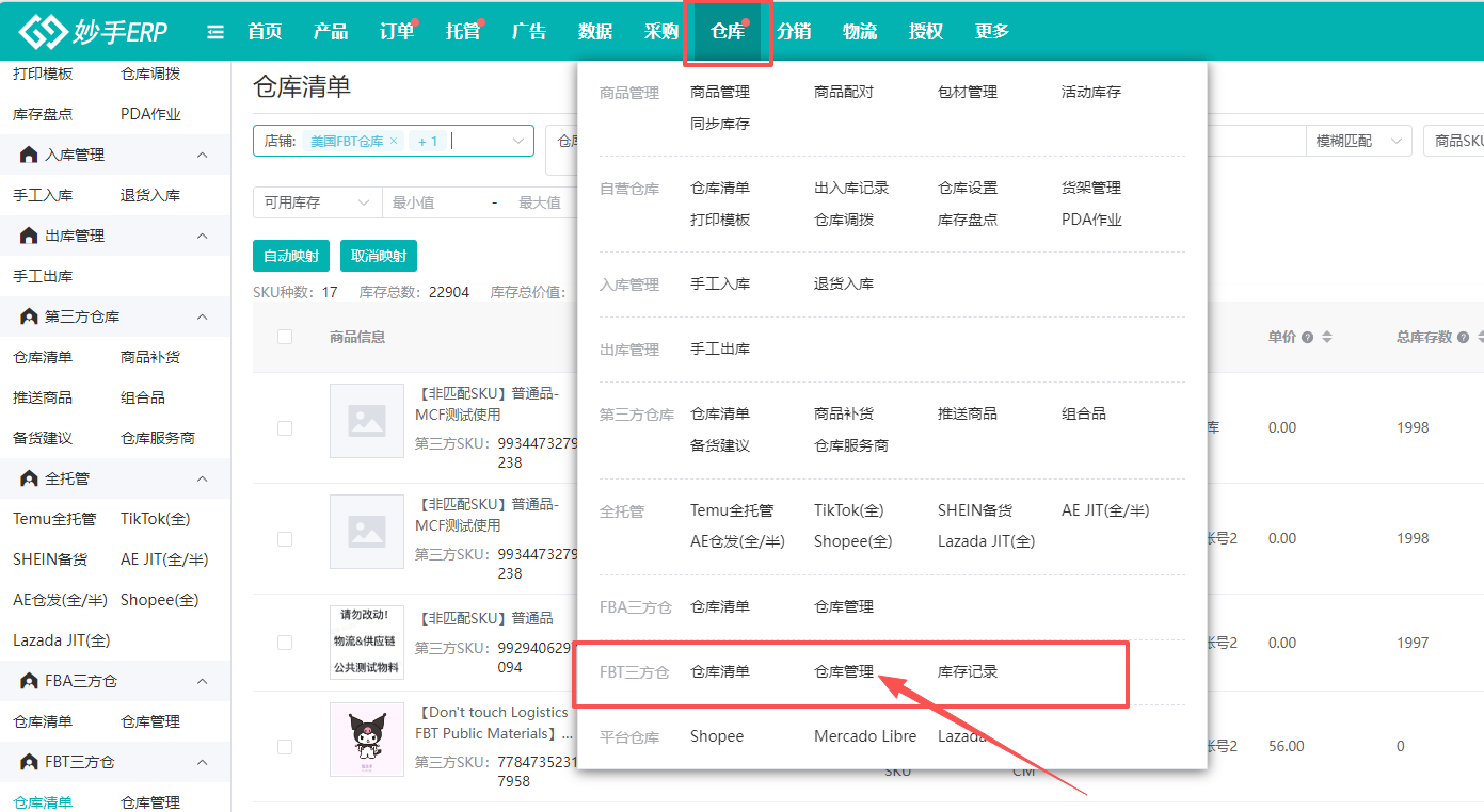 (1)继续进入仓库=>FBT三方仓=>仓库管理