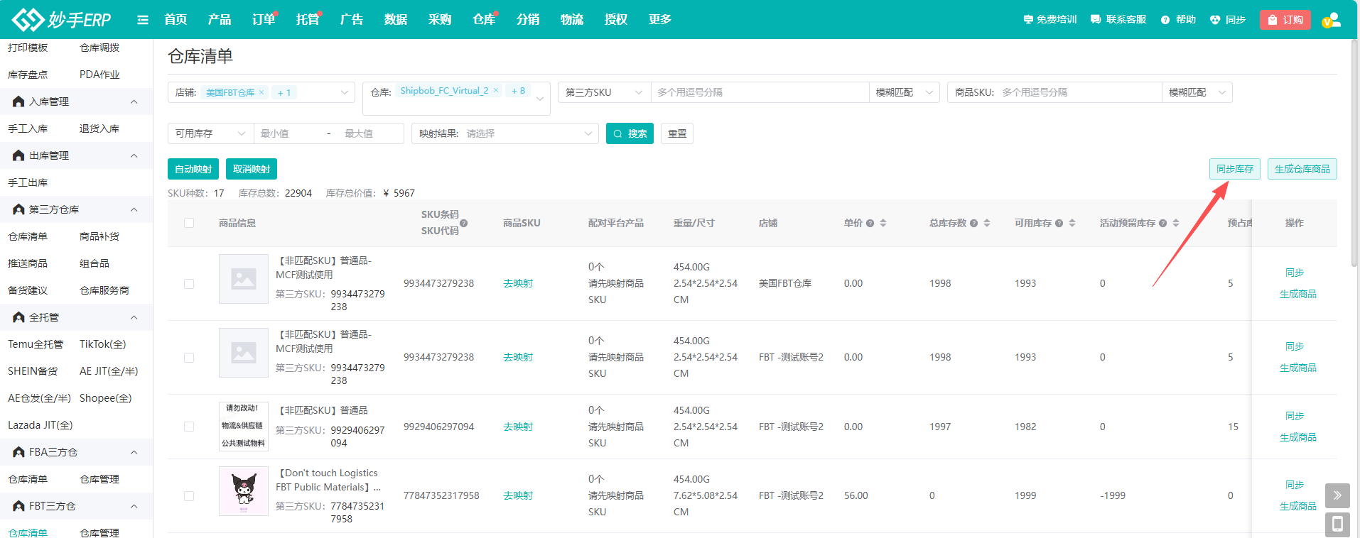 (1)继续进入仓库=>FBT三方仓=>仓库清单,界面中会显示FBT仓库已有的仓库商品,第一次授权可点击【同步商品】同步一下