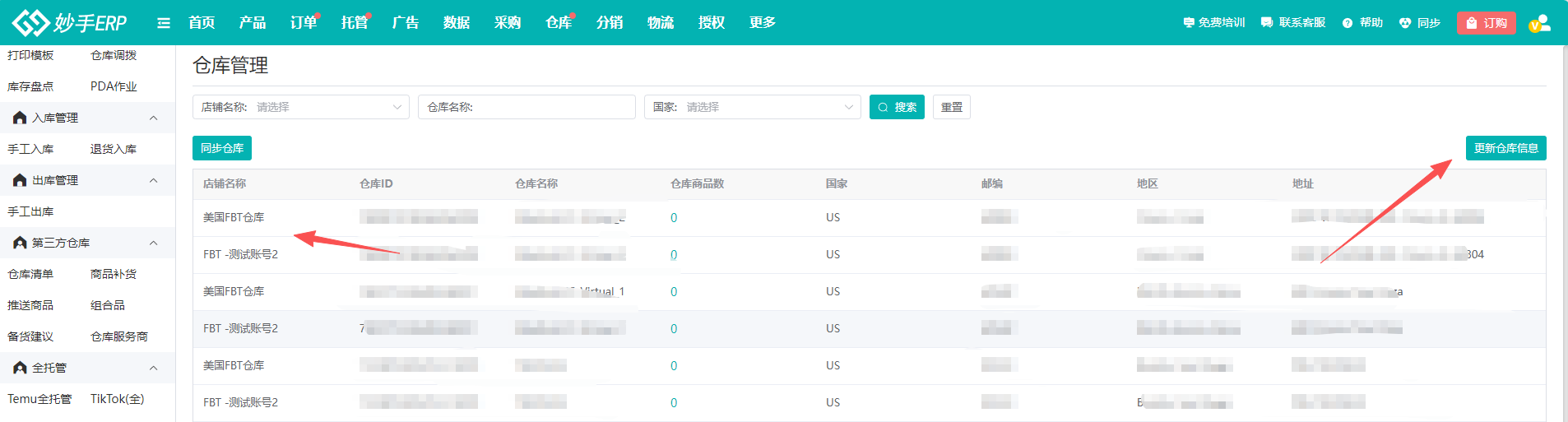 (3)仓库数据同步到妙手ERP后,可在列表中查看仓库详情,支持点击【更新仓库信息】更新